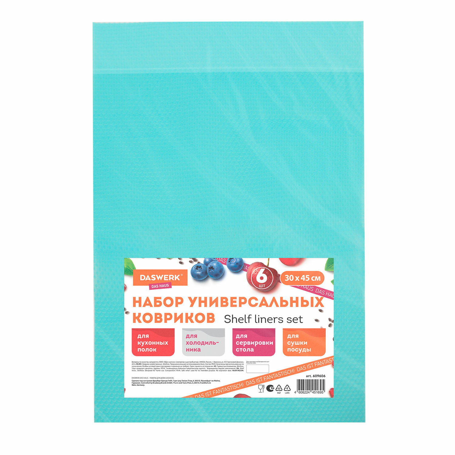 Коврики универсальные 6 шт., 30х45 см, для холодильника, полок, сервировки, бирюзовый, DASWERK (ДАСВЕРК) Код товара: 609606 144,21 ₽ Купить Производитель:DASWERK Набор универсальных ковриков DASWERK обеспечит надежную защиту поверхностей от влаги, жира, пятен, а также от царапин, сколов и других механических повреждений. Коврики DASWERK станут незаменимым аксессуаром в доме и на даче! Набор универсальных хозяйственных ковриков DASWERK включает шесть прямоугольных ковриков размером 30х45 см. Эти коврики станут незаменимыми в доме и на даче, обеспечивая защиту любых поверхностей от влаги, жира, пятен, а также от царапин и других механических повреждений. Главное достоинство ковриков – их многофункциональность: вы сможете использовать их для полок холодильника, выдвижных ящиков, эстетичной сервировки стола в качестве плейсматов, сушки посуды и полок для обуви. Коврики можно постелить на подоконник под горшки с комнатными растениями или обустроить зону кормления домашних питомцев, что значительно упростит уборку. Кроме того, коврики легко нарезаются ножницами, позволяя создать фрагменты нужного размера и формы. Коврики изготовлены из экологически безопасного, гипоаллергенного и износостойкого материала ПЭВА / PEVA (полиэтиленвинилацетат). Толщина ковриков составляет от 0,2 до 0,5 мм, а плотность – 260 г/м2. Температурный диапазон эксплуатации ковриков варьируется от -40 до +60 °С, что позволяет использовать их даже в морозильной камере. Важно отметить, что коврики обладают антискользящими свойствами благодаря своей особой неровной поверхности с выпуклыми кругами. Кроме того, за счет водонепроницаемости универсальные коврики из ПЭВА очень просты в уходе: их достаточно ополоснуть под водой или протереть влажной салфеткой.Производство: КитайНазначение для: кухонных ящиков,, под обувь, полок, сервировки, холодильника,Размер: 30х45 смФорма: прямоугольнаяФактура: кругиКоличество в комплекте: 6 шт.Цвет: бирюзовыйМатериал: ПЭВАСерия: UniversalВес: 228 грРазмер упаковки: 0.4 × 45.2 × 30.4 смОбъём: 0.0005 м3Промежуточная упаковка: 120 штТранспортная упаковка: 120 штШтрих-код: 4606224451695 Сертификат-1.jpg Сертификат-2.jpg Сертификат-3.jpg