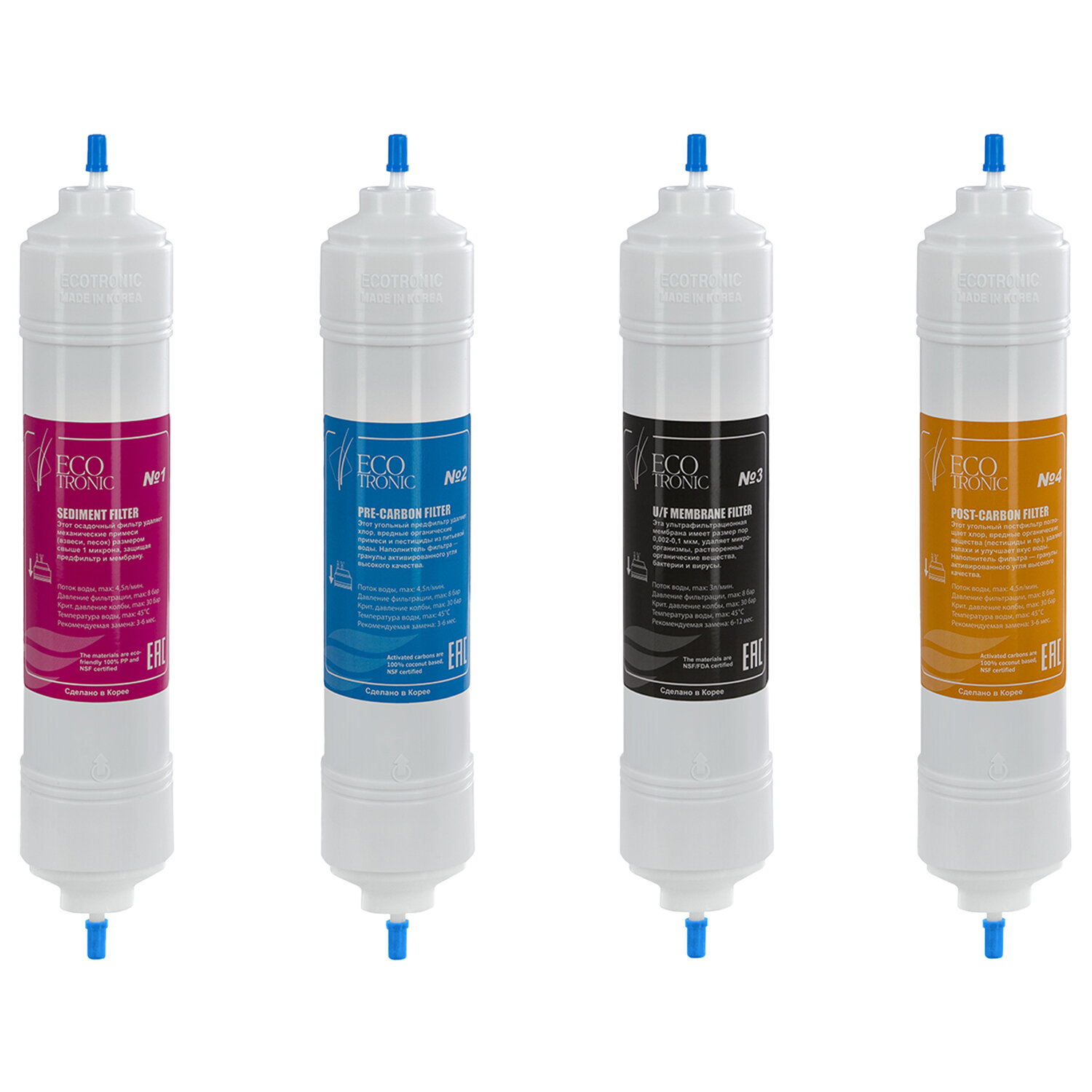 Фильтры для пурифайеров 14 дюймов, ресурс до 12 000 л, КОМПЛЕКТ 4 шт., ECOTRONIC Код товара: 456876 7 865,41 ₽ Купить Производитель:ECOTRONIC Фильтры для пурифайера ECOTRONIC обеспечивают четырёхступенчатую ультрафильтрацию воды. Они удаляют механические примеси, хлор, хлорорганические соединения, вирусы, микробы и другие загрязнения. Комплект сменных фильтров (картриджей) с ультра-фильтрационной мембраной (UF) предназначен для установки в настольные и напольные пурифайеры. Подобные пурифайеры маркируются после дефиса xx-U4L или xx-U4T, где xx – серия и номер модели, U – ультрафильтрация, 4 ступени очистки, L или Т – напольный или настольный. В комплекте идет 4 картриджа: - Осадочный фильтр, удаляющий примеси размером больше 1 мкм и защищающий предфильтр и мембрану; - Угольный предфильтр, удаляющий хлор, органические примеси и пестициды; наполнитель фильтра: гранулы активированного угля высокого качества; - Ультрафильтрационная мембрана, удаляет бактерии, вирусы, тонкие частицы и растворенные минералы и соли; - Угольный постфильтр для финальной доочистки воды и улучшения ее вкуса (поток: 4,5 л/мин). Рекомендуемая замена фильтров не реже 1 раза в 6 месяцев. Ресурс каждого картриджа до 12 000 литров в зависимости от качества водопроводной воды. При большом потреблении (в больших офисах, фитнесах) фильтры могут меняться 1 раз в 3 или 2 месяца. Размер – 14 дюймов. Производство – Южная Корея. Производитель оставляет за собой право без предварительного уведомления вносить изменения в технические характеристики, комплектацию и конструкцию, не ухудшающие эксплуатационные характеристики изделия.Производство: КитайТип фильтра: для пурифайеровСерия: ClassicВид фильтрации: УльтрафильтрацияКоличество в комплекте: 4 шт.Размер фильтра: 14 дюймовРесурс (зависит от качества исходной воды): 12000 лМатериал корпуса: пластикЦвет корпуса: белыйВес: 1,88 кгРазмер упаковки: 8 × 38.4 × 27.7 смОбъём: 0.0085 м3Промежуточная упаковка: 1 штТранспортная упаковка: 1 штШтрих-код: 4627167801088 Сертификат-1.jpg Сертификат-2.jpg Сертификат-3.jpg