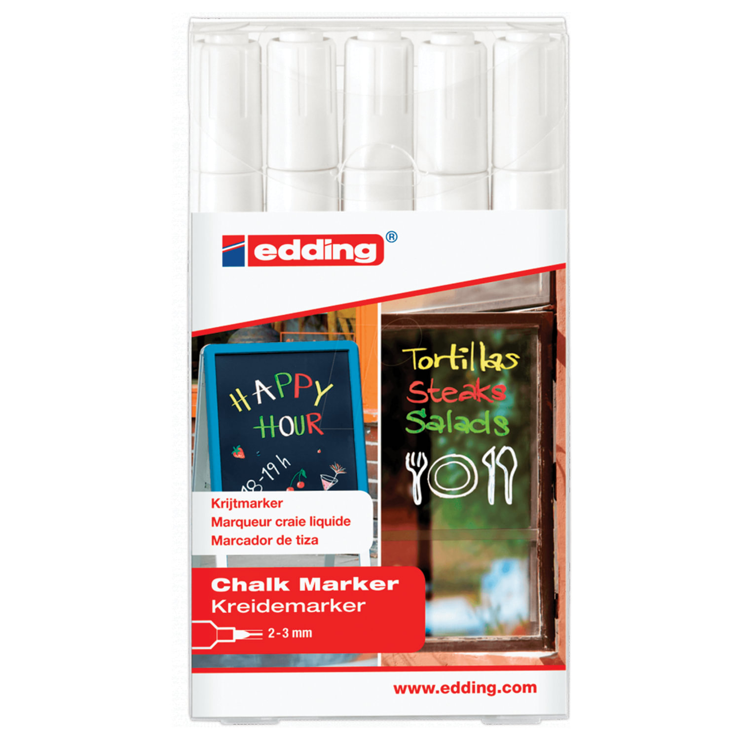 Маркеры меловые EDDING 4095 НАБОР 5 шт., 2-3 мм, БЕЛЫЕ, влагостираемые, для гладких поверхностей Код товара: 151334 1 616,75 ₽ Купить Производитель:EDDING Универсальный влагостираемый маркер на меловой основе предназначен для нанесения информации на любую гладкую поверхность – стекло, кафель, керамику, пластик. Корпус маркера изготовлен из прочного пластика. Маркер EDDING-4095 имеет устойчивый к стиранию круглый (пулевидный) наконечник.Маркер предназначен для гладких поверхностей, но возможно использование и на деликатных пленчатых поверхностях, меловых досках, а также на ряде шероховатых поверхностей.Чернила на основе разведенного мела не имеют запаха, не токсичны, содержат высокую концентрацию меловых частиц, что позволяет им хорошо ложиться и оставлять густую, плотную линию даже на темных поверхностях.Многие столичные супермаркеты и гипермаркеты уже используют наш маркер для нанесения информации на пластиковые или картонные ценники в торговых залах. Достоинство новых информационных табличек очевидно – надпись легко наносится и ее можно обновить, она яркая, заметная и привлекает взгляд.Теперь с помощью маркера EDDING-4095 можно легко создать свой неповторимый фирменный стиль.Производство: ГерманияЦвет чернил: белыйСерия: 4095Количество в комплекте: 5 шт.Форма наконечника: круглыйМинимальная толщина линии письма: 2 ммМаксимальная толщина линии письма: 3 ммСпецэффект чернил: -Наконечник устойчив к повреждению и истиранию: даТип стирания: влагостираемыйФорма корпуса: круглаяДиаметр корпуса: 18 ммМатериал корпуса: пластикОснова чернил: меловаяУпаковка: пластиковая коробкаСрок годности: 48 месВес: 139 грРазмер упаковки: 1.9 × 14.7 × 8 смОбъём: 0.0003 м3Промежуточная упаковка: 64 штТранспортная упаковка: 64 штШтрих-код: 4004764963683 Файлы Сертификат-1.jpg Сертификат-2.jpg Сертификат-3.jpg Сертификат-4.jpg Сертификат-5.jpg Сертификат-6.jpg Сертификат-7.jpg Сертификат-8.jpg Сертификат-9.jpg Сертификат-10.jpg Сертификат-11.jpg Сертификат-12.jpg Сертификат-13.jpg Сертификат-14.jpg Сертификат-15.jpg Сертификат-16.jpg Сертификат-17.jpg Сертификат-18.jpg Сертификат-19.jpg Сертификат-20.jpg Сертификат-21.jpg Сертификат-22.jpg Сертификат-23.jpg Сертификат-24.jpg Сертификат-25.jpg Сертификат-26.jpg