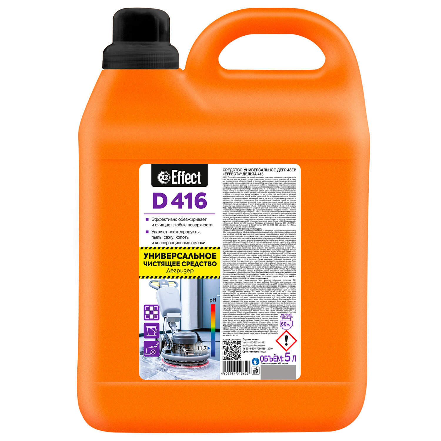 Чистящее средство универсальное (дегризер) щелочное 5 л, EFFECT "Delta 416" Код товара: 700254 1 548,06 ₽ Купить Производитель:EFFECT Средство EFFECT "Delta 416" предназначено для профессионального и бытового мытья полов, стен, фасадов, очистки деталей, кузовов транспортных средств и других поверхностей, а также для предварительной обработки тканей от сложных загрязнений. Подходит для использования в гостиничном секторе, на объектах ЖКХ, в химчистках и прачечных, в образовательных учреждениях, включая школьные и дошкольные, в ЛПУ, на предприятиях общественного питания и пищевой промышленности, в офисных помещениях. Способ применения: при очистке поверхностей вручную приготовить водный раствор в концентрации 2%-9% (20-90 мл на 1 л воды). Равномерно нанести раствор на обрабатываемую поверхность щеткой, губкой или методом распыления с использованием оборудования высокого или низкого давления. Также можно погрузить изделие в раствор. Выдержать раствор в течение 1-10 минут (при методе погружения – до 5 часов), при необходимости растереть обрабатываемую поверхность щеткой, а затем смыть водой. После промывки поверхность тщательно просушить. Для удаления сильных загрязнений нанести раствор на обрабатываемую поверхность повторно или обработать концентратом. Для предварительной обработки тканей от сложных масложировых и индустриальных загрязнений перед стиркой: приготовить водный раствор средства 1:20, оставить ткань в растворе до 10 минут (в зависимости от типа загрязнения), прополоскать, далее стирать обычным способом. Меры предосторожности: будьте осторожны! Содержит щелочные компоненты. При работе с концентратом необходимо использовать резиновые перчатки, очки, спецодежду. При попадании на слизистую оболочку глаз обильно промыть водой, обратиться к врачу. При попадании в глаза и на кожу вызывает раздражение. При попадании на кожу промыть большим количеством воды. При необходимости обратиться за медицинской помощью. Вредно для водных организмов. Не смешивать с кислотами и другими веществами. Условия хранения: хранить в плотно закрытой упаковке в недоступном для детей месте, отдельно от пищевых продуктов. Средство замерзает, после размораживания сохраняет свои свойства. Состав: более 5%, но менее 15% смесь НПАВ и КПАВ; 5% фосфаты. Значение pH – 11,7. Срок годности – 2 года. По истечении срока годности упаковку и при необходимости средство утилизировать как бытовой отход.Производство: РоссияФорма выпуска: жидкостьСерия: DELTA 416Объем/вес: 5000 мл/гПрофессиональное средство: даЭффект от использования: очищение поверхностиПодходит для поверхностей: кафель, линолеум, металл, пластикОсобенности: универсальноеОтдушка: нетСодержит: щелочьРазрешено для детских учреждений: даОбласть применения: бытовое использование, государственные учреждения, пищевая промышленность, предприятия общественного питания, санаторно-курортные учреждения, сфера услуг, учреждения образования (школьные, дошкольные, средние, высшие)pH: 11.7Дозатор: нетУпаковка: канистраСрок годности: 36 месВес: 5,76 кгРазмер упаковки: 28.6 × 19.1 × 13.5 смОбъём: 0.0085 м3Промежуточная упаковка: 2 штТранспортная упаковка: 2 штШтрих-код: 4602984013623 Файлы Сертификат-1.jpg Сертификат-2.jpg Сертификат-3.jpg Сертификат-4.jpg Сертификат-5.jpg Сертификат-6.jpg Сертификат-7.jpg Сертификат-8.jpg Сертификат-9.jpg Сертификат-10.jpg Сертификат-11.jpg Сертификат-1