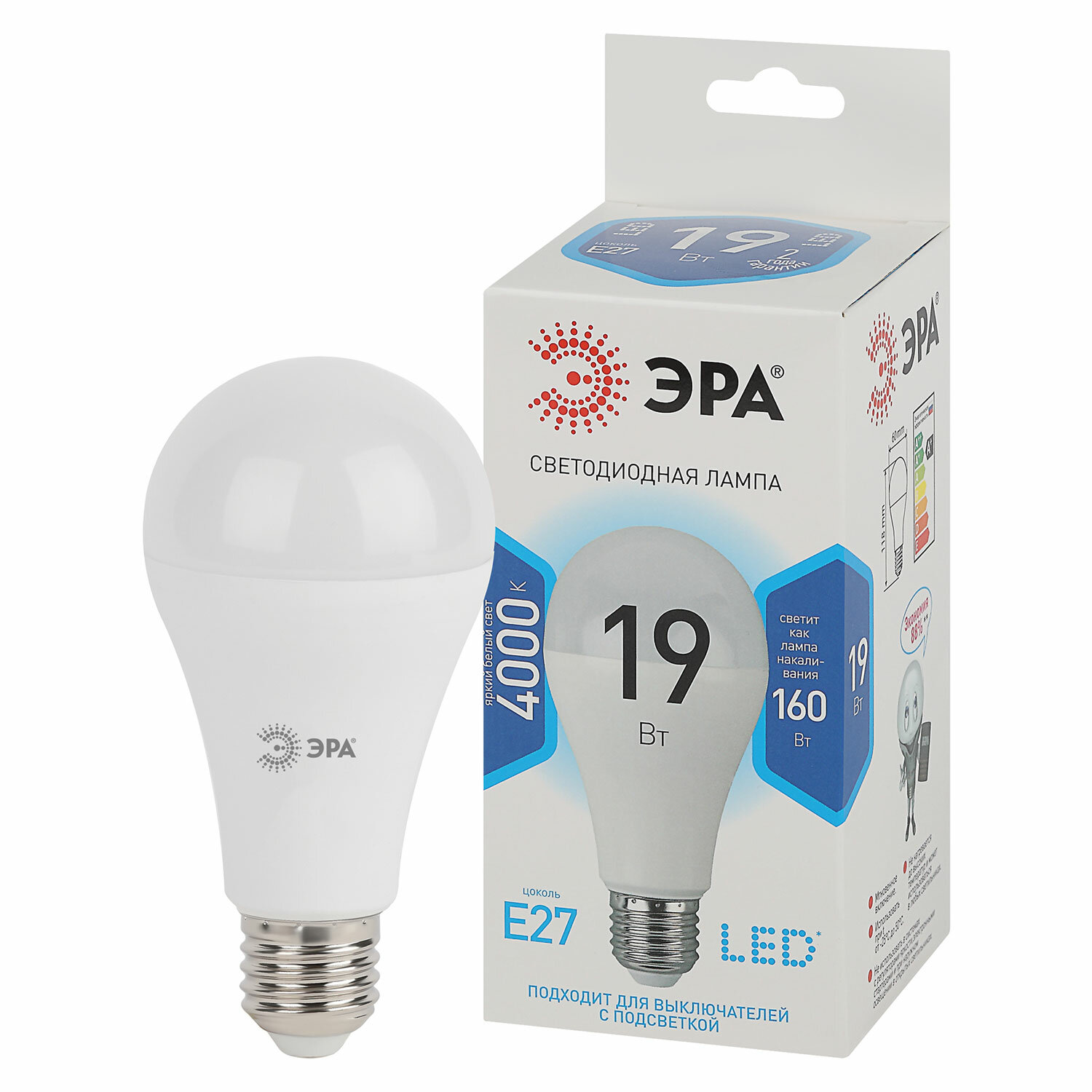 Лампа светодиодная ЭРА STD, 19 (160) Вт, цоколь E27, груша, нейтральный белый свет, 35000 ч., LED A65-19W-840-E27 Код товара: 457670 176,4 ₽ Купить Производитель:ЭРА Светодиодная лампа ЭРА серии "Стандарт" - современный, качественный и доступный источник света. Позволяет экономить до 90% электроэнергии по сравнению с лампой накаливания с аналогичным световым потоком. Светит ярким белым светом, который максимально приближен к естественному дневному. Идеальна для ежедневного применения в быту. Мгновенное включение. Ровное освещение. Можно использовать как с люстрами, так и со светильниками, в том числе настольными и бра.Производство: Китай Тип цоколя : E27Оттенок света: нейтральный белыйМощность: 19 ВтТип лампы: светодиоднаяТип колбы: грушаВид колбы: матоваяМинимальное рабочее напряжение: 170 ВМаксимальное рабочее напряжение: 265 ВМощность эквивалентной по световому потоку лампы накаливания: 160 ВтСветовой поток: 1520 ЛмЦветовая температура: 4000 КИндекс цветопередачи: 80 %Срок службы: 35000 ч.Высота (длина) лампы: 112 ммДиаметр лампы: 60 ммВес: 58 грРазмер упаковки: 6.3 × 15.5 × 6.3 смОбъём: 0.0006 м3Промежуточная упаковка: 10 штТранспортная упаковка: 100 штШтрих-код: 5056183711696 Файлы Сертификат-1.jpg Сертификат-2.jpg Сертификат-3.jpg Сертификат-4.jpg Сертификат-5.jpg