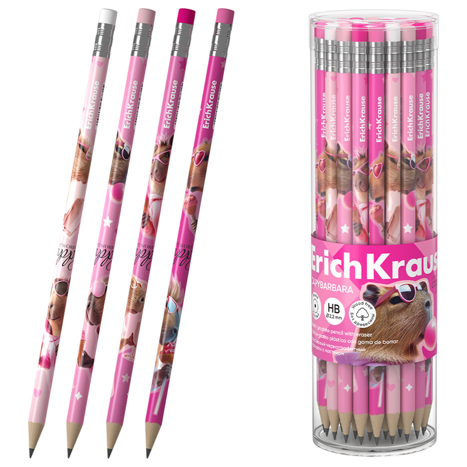 Карандаш чернографитный с ластиком ERICH KRAUSE "CapyBarbara", НВ Код товара: 182140 31,7 ₽ Купить Производитель:ERICH KRAUSE Чернографитный круглый карандаш ERICH KRAUSE "CapyBarbara" из пластика с ударопрочным грифелем, твёрдость – HB. Благодаря специальной технологии изготовления карандаша методом экструзии грифель надежно фиксируется к корпусу. Идеальная центровка грифеля гарантирует легкую заточку с экономным расходом карандаша. Грифель диаметром 2,2 мм не царапает бумагу и не крошится при рисовании. Ластик карандаша средней жесткости изготовлен из экологически чистого и гипоаллергенного материала термопластичной резины (TPR). Не содержит ПВХ. Длина – 188 мм.Производство: КитайТвердость: HBЗаточенный: даНаличие ластика: даДиаметр грифеля: 2.2 ммКоличество карандашей в упаковке: 42 шт.Количество твердостей в наборе: 1Серия: DesignФорма корпуса: круглаяУдаропрочный грифель: даДлина карандаша: 188 ммМатериал корпуса: пластикЦвет корпуса: с дизайномДизайн: КапибараВ наборе: стирательная резинкаКоличество дизайнов в упаковке: 4 шт.Упаковка: пластиковый тубусВес: 9 грРазмер упаковки: 0.7 × 18.7 × 0.7 смПромежуточная упаковка: 42 штТранспортная упаковка: 2688 штШтрих-код: 4041485627715 Сертификат-1.jpg Сертификат-2.jpg Сертификат-3.jpg