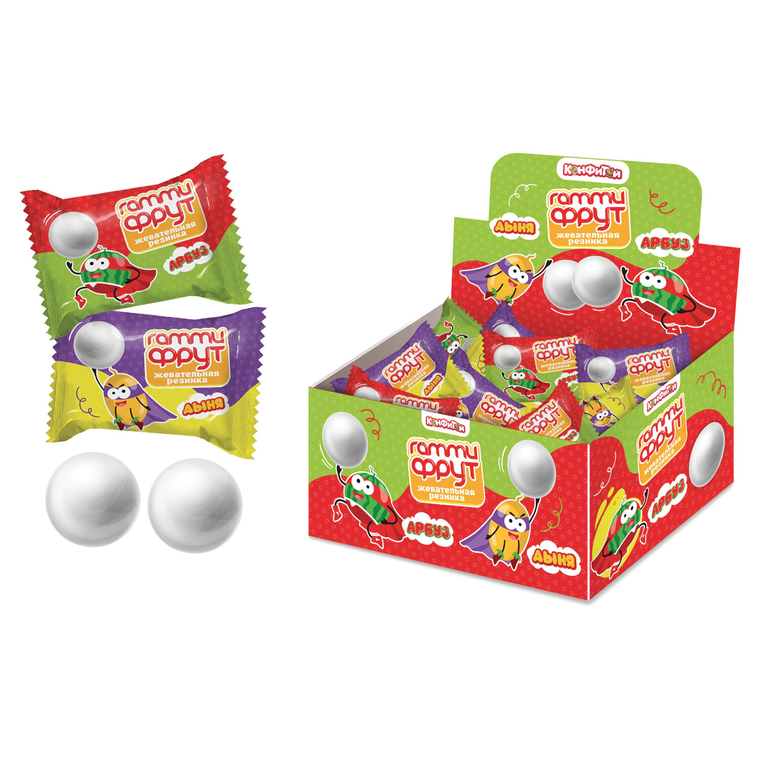 Жевательная резинка ГАММИ ФРУТ (арбуз, дыня), 3 г, КОНФИТОЙ Код товара: 624396 4,12 ₽ Купить Производитель:ГАММИ ФРУТ Сладкая и сочная жвачка-шарик ГАММИ ФРУТ КОНФИТОЙ в индивидуальной упаковке. В дисплее два разных вкуса: арбуз и дыня. Удобный формат дисплея подойдет для любого формата торговой точки. Состав: сахар, полимерная основа, патока, влагоудерживающий агент (глицерин пищевой), регулятор кислотности (кислота лимонная), ароматизаторы ("Арбуз", "Дыня"), краситель пищевой ("Диоксид титана Е171"), глазирователь (воск карнаубский). Хранить в сухом и прохладном месте при температуре от 15 до 21 °С и относительной влажности не более 75%. Избегать попадания прямых солнечных лучей. Пищевая ценность продукта на 100 г: белки – 0 г, жиры – 0 г, углеводы – 73 г. Энергетическая ценность в 100 г – 292 ккал.Производство: РоссияТип: жевательная резинкаВес нетто: 3 гКоличество в упаковке: 1 шт.Вкус: арбуз, дыняУпаковка: флоу-пакСрок годности: 24 мес.Фирма-производитель: КОНФИТОЙСрок годности: 24 месВес: 4 грРазмер упаковки: 1.8 × 4.8 × 3 смПромежуточная упаковка: 100 штТранспортная упаковка: 2000 штШтрих-код: 4660040684460 Файлы Сертификат-1.jpg Сертификат-2.jpg Сертификат-3.jpg Сертификат-4.jpg Сертификат-5.jpg Сертификат-6.jpg