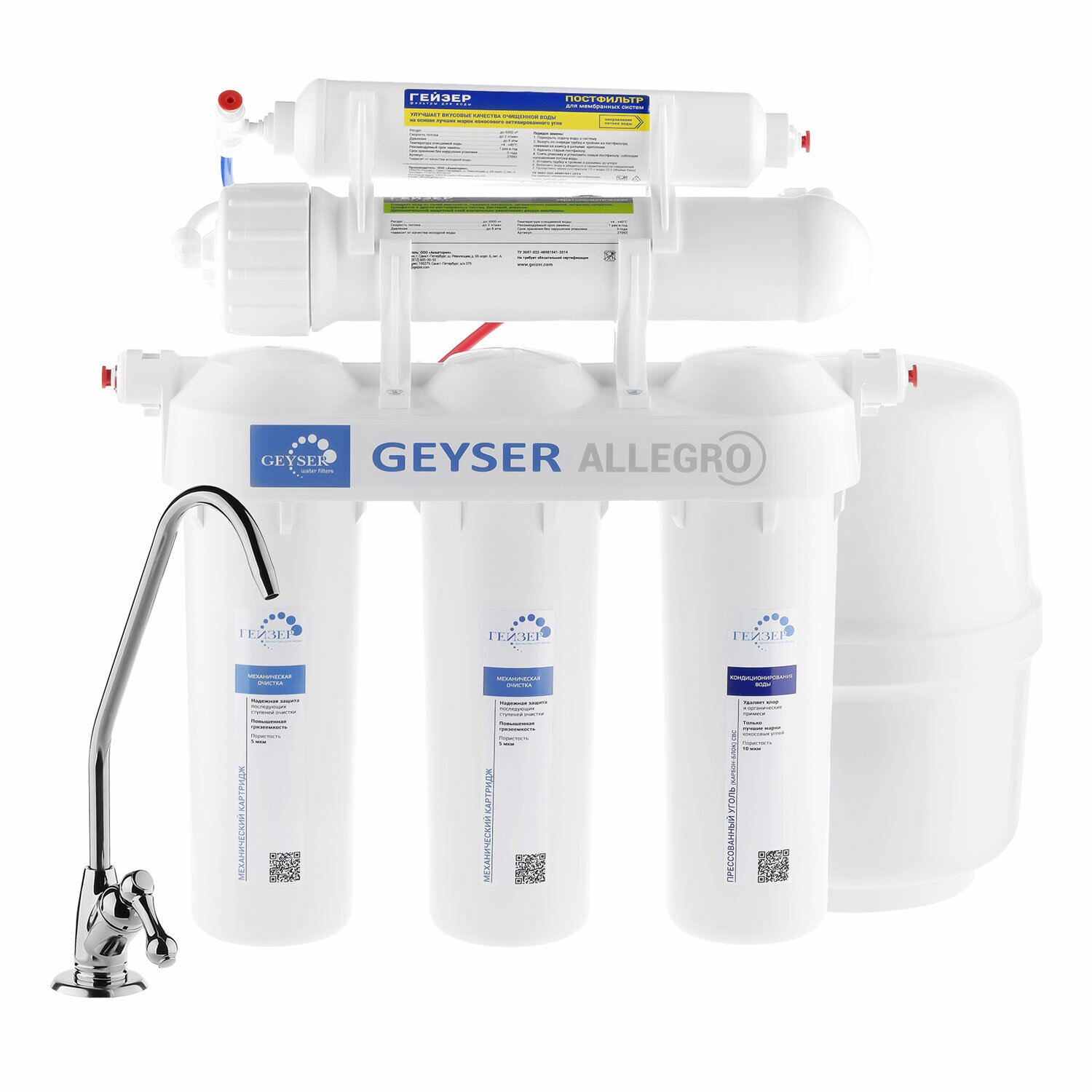 Фильтр для воды ГЕЙЗЕР "Аллегро", обратный осмос, 5 ступеней очистки, бак 12 л, кран в комплекте Код товара: 609290 9 180 ₽ Купить Производитель:ГЕЙЗЕР Фильтр для воды ГЕЙЗЕР "Аллегро" идеально очищает даже очень жесткую водопроводную воду. Для установки в напорной сети колбы имеют двойное уплотнение. Технология обратного осмоса, использованная в фильтре, заключается в фильтрации воды через полупроницаемую мембрану. Размеры пор мембраны настолько малы, что пропускают только молекулы воды. Размер молекул большинства примесей, а также бактерий и вирусов, значительно больше молекул воды, поэтому они не проходят через мембрану. Система работает при давлении в подводящей магистрали не менее 3 атм. Преимущества: Максимальная степень очистки воды, возможная в домашних условиях. Удаление вредных примесей, включая бактерии и вирусы. Комплектуются накопительным баком 12 л. Идеально подходит для очистки воды с высокой жесткостью. Максимальный объем очищенной воды - 7,5 л. Специальный клапан для сброса воды в дренаж при превышении давления в баке выше 4 атм. Двойное уплотнение колб. Все необходимое для подключения в комплекте. Этапы очистки воды системой обратного осмоса ГЕЙЗЕР "Аллегро": Предварительная очистка (подготовка воды для увеличения срока службы мембраны): осадочные картриджи РР 5 - 10SL – удаляют нерастворимые частицы размером до 5 мкм (ржавчина, взвеси) - 2 шт.; CBC 10 - 10SL – карбон-блок из высококачественного кокосового активированного угля пористостью 10 мкм. - 1 шт. Ресурс – 6–12 месяцев в зависимости от качества воды. Обратноосмотическая мембрана Geyser 1812-50 GPD – удаление всех примесей, включая бактерии и вирусы. Ресурс – 1–3 года (зависит от качества воды). Угольный постфильтр (активированный уголь) – улучшает вкусовые качества воды. Ресурс – 12 месяцев. Производитель оставляет за собой право без предварительного уведомления вносить изменения в технические характеристики, комплектацию и конструкцию, не ухудшающие эксплуатационные характеристики изделия.Производство: РоссияТип фильтра: система обратного осмосаЧисло ступеней очистки: 5Производительность: 0.14 л/мин.Максимальная температура очищаемой воды: 40 °CРабочее давление в системе водоснабжения: 3-8 атмНазначение : очистка от бактерий и вирусов, очистка от механических примесей, очистка от хлора и его соединений, удаление тяжелых металлов, умягчение воды, устранение постороннего привкуса и запахаУровень жесткости воды: жесткая (от 8 до 12 мг-экв/л), очень жесткая (более 12 мг-экв/л), средней жесткости (от 4 до 8 мг-экв/л)Наличие накопительного бака: даНаличие крана в комплекте: даСпособ установки : под мойкуОбъем накопительного бака: 12 лРазмер: 43х47х42 смВес: 5 кгРазмер упаковки: 36.8 × 38.3 × 37.1 смОбъём: 0.0523 м3Промежуточная упаковка: 1 штТранспортная упаковка: 1 штШтрих-код: 4607056508441 Файлы Приложение-1.pdf Сертификат-1.jpg Сертификат-2.jpg Сертификат-3.jpg