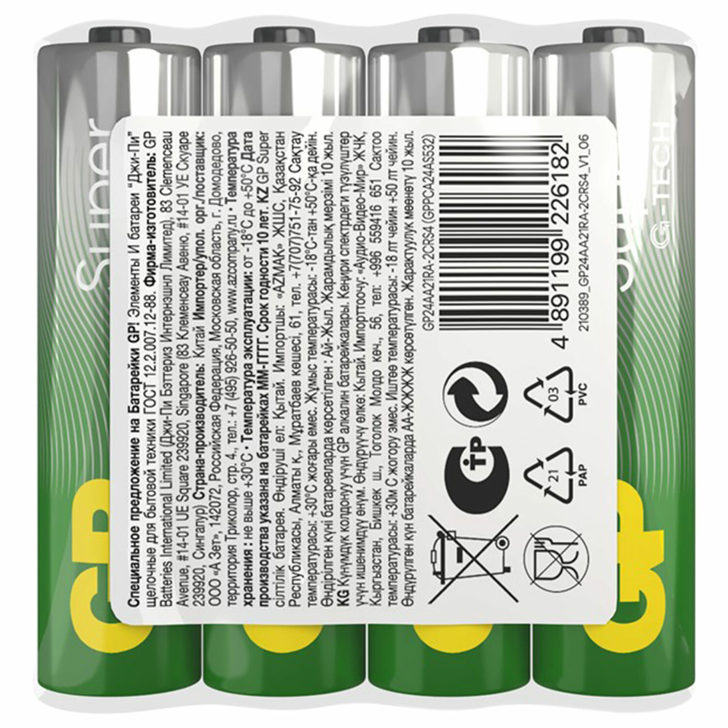 Батарейки КОМПЛЕКТ 4 шт., GP Super G-Tech, AAA (LR03, 24А), алкалиновые, мизинчиковые, в пленке, 24AR Код товара: 454089 201,26 ₽ Купить Производитель:GP Алкалиновые батарейки GP размера AAA увеличенной продолжительности работы идеально подходят для приборов с высоким потреблением энергии, таких как механизированные игрушки, фонарики, портативные игровые консоли, пульты дистанционного управления. Батарейки GP – это надежные элементы питания, которые обеспечивают стабильную работу устройств. В процессе изготовления использовались качественные материалы и тщательно соблюдались стандарты безопасности; они оптимально подходит для бытового применения. Неиспользованные батарейки GP могут сохранять заряд до 10 лет при хранении в обычных условиях. С этими батарейками можете полностью положиться на свое устройство. Поставляются комплектом из 4 штук в пленке. Вся информация о товарах на сайте носит справочный характер и не является публичной офертой в соответствии с пунктом 2 статьи 437 ГК РФ. Производитель оставляет за собой право изменять характеристики товара, его внешний вид и комплектность без предварительного уведомления продавца.Производство: КитайФорма батарейки: AAA (мизинчиковые)Серия: SuperТипоразмер: AAA (мизинчиковая, R03, LR03, 286, 24A, 24D)Технология: алкалиноваяНапряжение: 1.5 ВКоличество в упаковке: 4 шт.Упаковка: термоусадочная пленкаСрок годности: 120 месВес: 52 грРазмер упаковки: 1.1 × 4.5 × 4.4 смОбъём: 0.0001 м3Промежуточная упаковка: 24 штТранспортная упаковка: 96 штШтрих-код: 4891199071850 Файлы Сертификат-1.jpg Сертификат-2.jpg Сертификат-3.jpg Сертификат-4.jpg