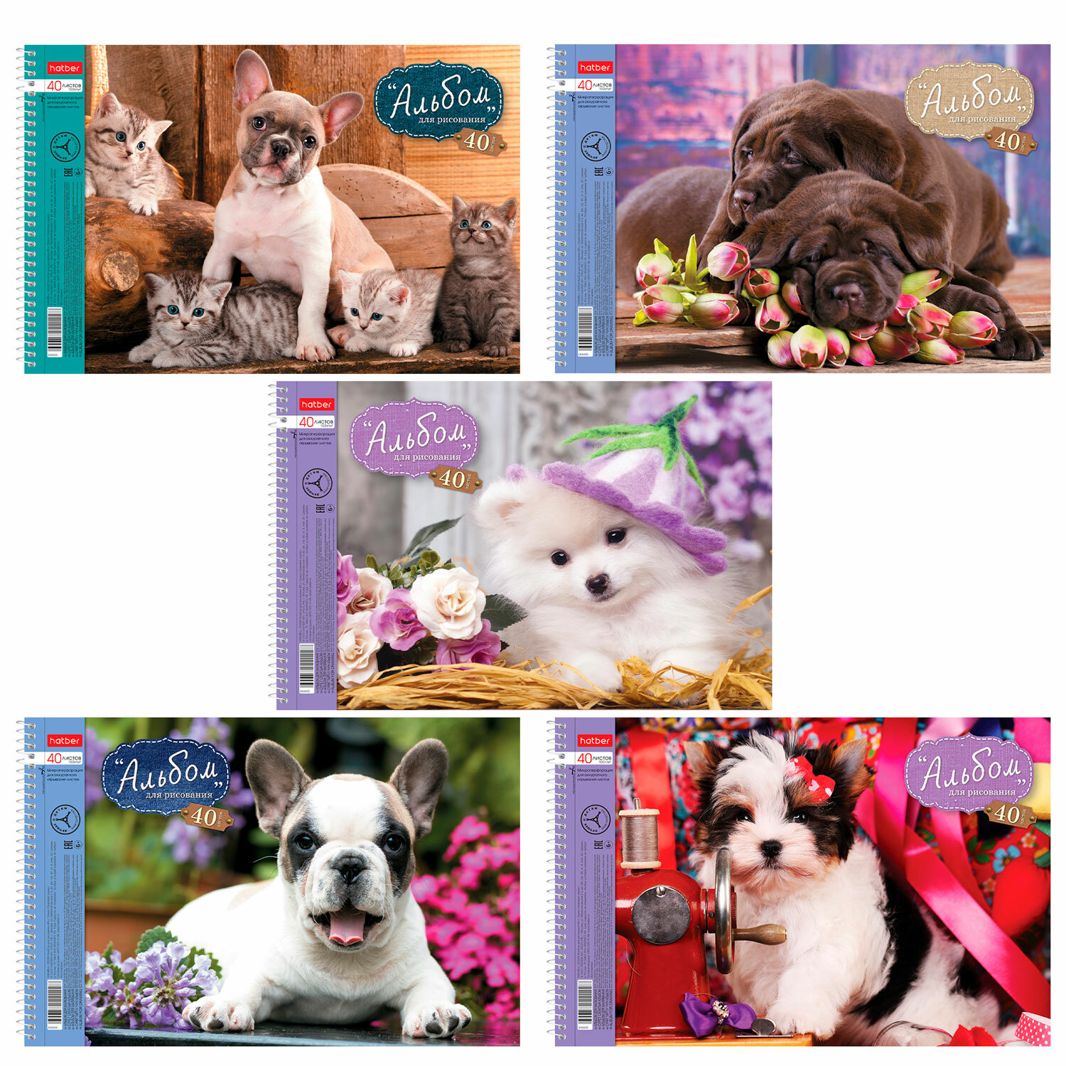 Альбом для рисования, А4, 40 листов, спираль, обложка картон, HATBER, 205х300 мм, "Любимцы" (5 видов), 004142