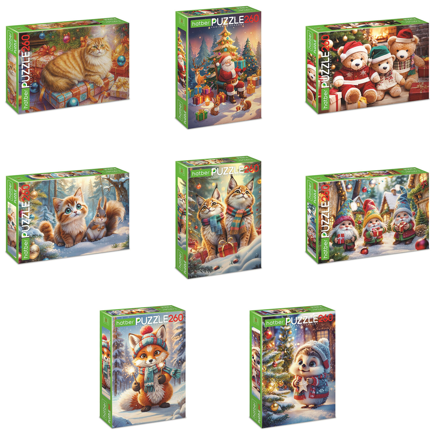 Пазл картонный НОВОГОДНИЙ 260 элементов АССОРТИ, 220х330 мм, HATBER Код товара: 665952 248,46 ₽ Купить Производитель:HATBER Пазл картонный HATBER из 260 элементов – это занимательная развивающая и обучающая игра, которая требует усидчивости, аккуратности, терпения и внимательности. 260 элементов дополнительно упакованы в прозрачный пакетик. Яркий, красочный дизайн придется по вкусу как детям, так и взрослым. Продукция соответствует стандартам качества. Упаковка – картонная коробка в термоусадочной пленке. Размер коробки – 17х24,5х3,8 см. Поставляется в нескольких вариантах дизайна без возможности выбора.Производство: РоссияКоличество элементов: 260 шт.Форма: прямоугольнаяОриентация: ассортиШирина: 220 ммДлина: 330 ммПредназначение: универсальныйСерия: Пазл картонныйДизайн: НовогоднийМатериал: картонУпаковка: картонная коробкаВес: 143 грРазмер упаковки: 3.9 × 24.8 × 17.1 смОбъём: 0.002 м3Промежуточная упаковка: 10 штТранспортная упаковка: 10 штШтрих-код: 4606782620618 Сертификат-1.jpg Сертификат-2.jpg Сертификат-3.jpg
