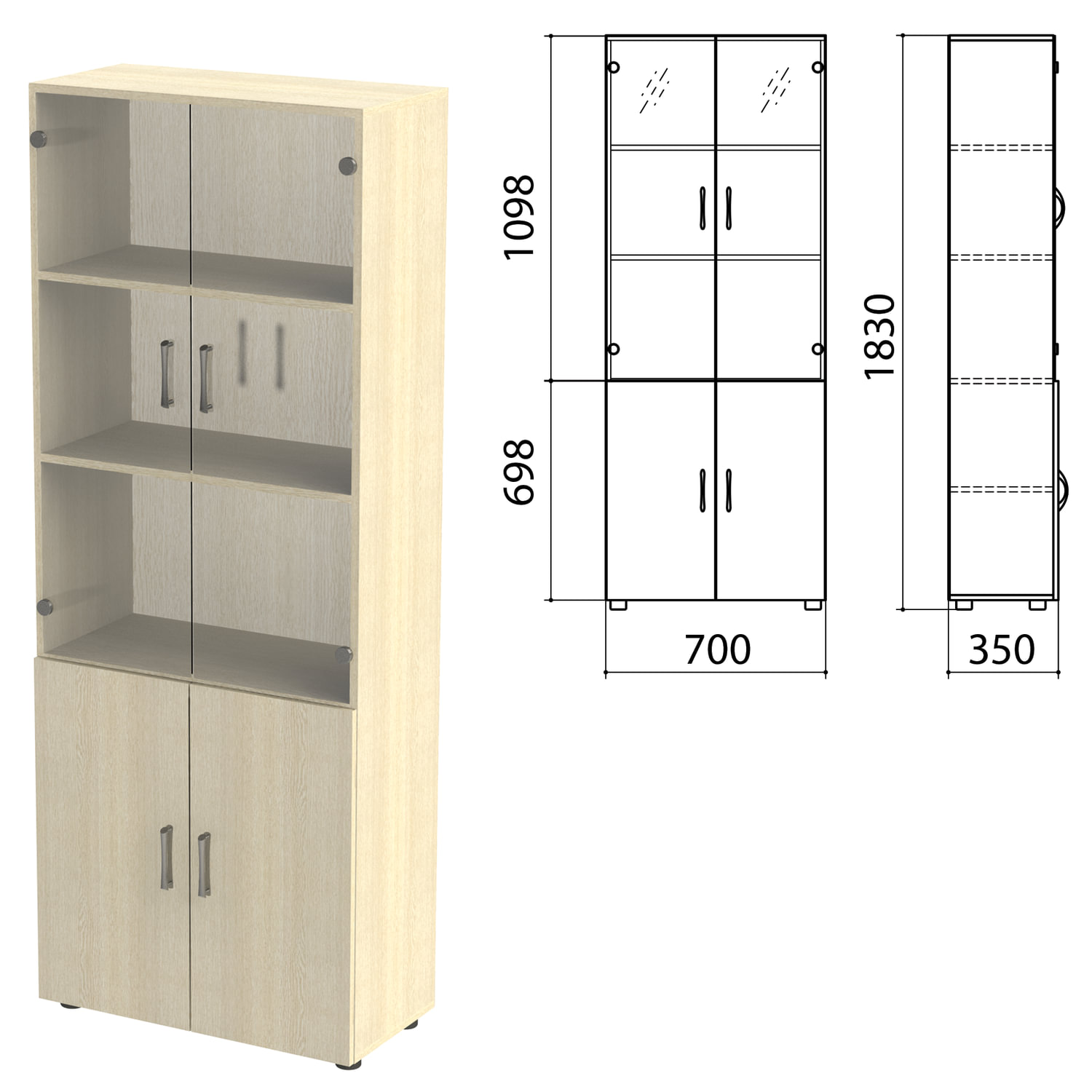Шкаф закрытый со стеклом "Канц", 700х350х1830 мм, цвет дуб молочный (КОМПЛЕКТ) Код товара: 980470 18 402,82 ₽ Купить Производитель:КАНЦ Шкаф предназначен для хранения документов, архивов и других предметов обихода. Полки стационарные. Регулируемые опоры позволяют компенсировать возможные неровности пола. Производство: РоссияКаркас и фасады - ЛДСП толщиной 16 мм.Кромка - ПВХ толщиной 0,5 мм.Задняя стенка - HDF толщиной 3,2 мм.Регулируемые опоры.Поставляется в разобранном виде.В комплект входит крепеж и инструкция по сборке.4 полки.Цвет фасада - дуб молочный.Цвет каркаса - дуб молочный.Размер (ШхГхВ) - 700х350х1830 мм.Вес: 49,3 кгОбъём: 0.0831 м3Промежуточная упаковка: 1 штТранспортная упаковка: 1 шт Файлы Приложение-1.zip Приложение-2.pdf Приложение-3.pdf Приложение-4.pdf