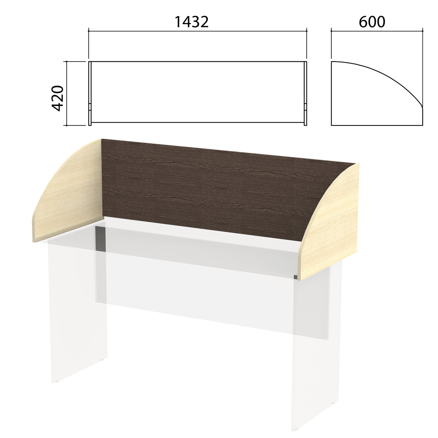 Экран-перегородка "Канц" 1432х600х420 мм, цвет венге/дуб молочный (КОМПЛЕКТ С ФУРНИТУРОЙ) Код товара: 980537 4 890,42 ₽ Купить Производитель:КАНЦ Экран-перегородка предназначен для разделения рабочего пространства сотрудников. Устанавливается на письменные столы "Канц" шириной 1400 мм. Поставляется вместе с фурнитурой. Производство: РоссияМатериал - ЛДСП 16 мм, кромка - ПВХ 0,5 мм.В комплект входит крепеж.Цвет передней стенки - венге.Цвет боковых стенок - дуб молочный.Размер (ШхГхВ) - 1432х600х420 мм.Вес: 16 кгОбъём: 0.0258 м3Промежуточная упаковка: 1 штТранспортная упаковка: 1 шт Приложение-1.zip Приложение-2.pdf