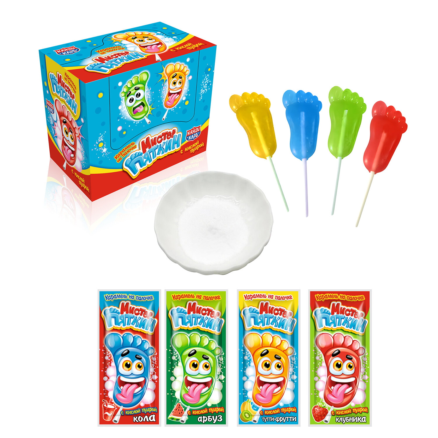 Карамель на палочке с кислой пудрой "Мистер Пяткин" ассорти, 11 г, КАНДИ КЛАБ Код товара: 624368 12,72 ₽ Купить Производитель:КАНДИ КЛАБ Каждый найдет свой любимый вкус в наборе карамели на палочке с кислой пудрой "Мистер Пяткин" КАНДИ КЛАБ. Всего в коробке из 48 штук четыре варианта вкуса – клубника, кола, арбуз, тутти-фрутти. Состав: сахар, глюкозный сироп, регулятор кислотности (лимонная кислота), ароматизаторы (клубника, кола, арбуз, тутти-фрутти), красители Е129, Е102, Е133, Е150d. Не рекомендовано детям до 3 лет. Без ГМО. Пищевая ценность (средние значения) на 100 г продукта: белки – 0 г, жиры – 0 г, углеводы – 75,3 г. Энергетическая ценность (калорийность) на 100 г продукта: 1265 кДж / 302 ккал. Условия хранения: хранить в сухом и прохладном месте при температуре от 1 до 25 °С и относительной влажности воздуха не более 75%. Избегать попадания прямых солнечных лучей.Производство: КитайТип товара: карамель леденцоваяВес нетто: 11 гВкус: клубника, кола, арбуз, тутти-фруттиФормат: карамель леденцоваяУпаковка: флоу-пакСоответствует требованиям ГОСТа: ЕАЭС N RU Д-CN.РА03.В.60479/24Срок годности: 36 мес.Фирма-производитель: Канди КлабСрок годности: 36 месВес: 13 грРазмер упаковки: 0.7 × 13.8 × 6.4 смОбъём: 0.0001 м3Промежуточная упаковка: 48 штТранспортная упаковка: 576 штШтрих-код: 4627197483254 Файлы Сертификат-1.jpg Сертификат-2.jpg Сертификат-3.jpg Сертификат-4.jpg Сертификат-5.jpg Сертификат-6.jpg Сертификат-7.jpg Сертификат-8.jpg Сертификат-9.jpg Сертификат-10.jpg Сертификат-11.jpg