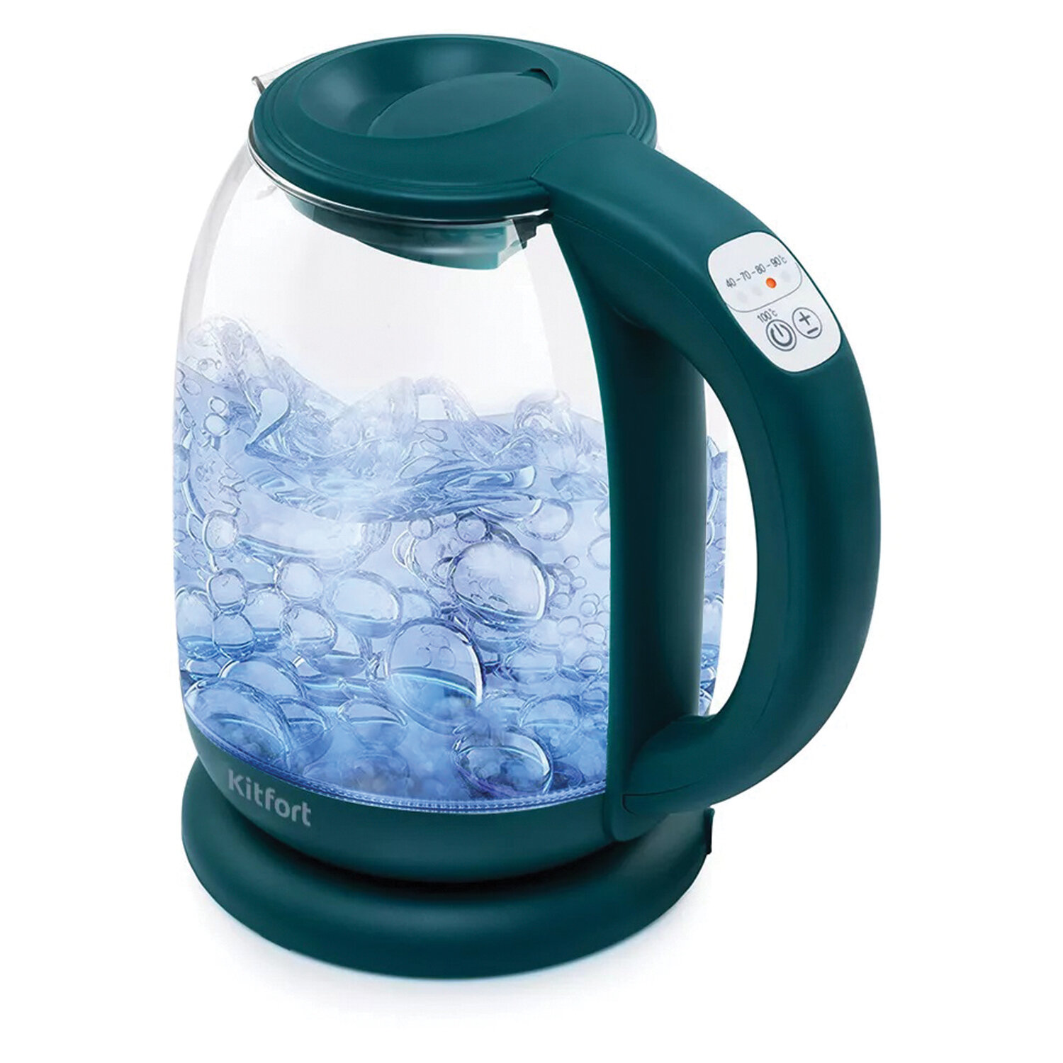 Чайник KITFORT КТ-640-4, 1,7 л, 2200 Вт, закрытый нагревательный элемент, ТЕРМОРЕГУЛЯТОР, стекло, изумрудный Код товара: 456014 2 410,65 ₽ Купить Производитель:KITFORT Стильный чайник KITFORT КТ-640 выполнен из стекла, пластика и нержавеющей стали. Благодаря оригинальному дизайну он идеально впишется в любой интерьер. Объем чайника составляет 1,7 л, что делает его идеальным для семьи или большой компании. Благодаря мощности 2200 Вт чайник вскипятит воду за считаные минуты. За счет быстрого закипания чайник экономит электроэнергию. Чайник оснащён электронным терморегулятором и может нагреть воду от 40 до 100 °С, что очень удобно при заваривании различных сортов чая, приготовлении кофе и подогрева детского питания. Температура контролируется встроенным в дно чайника термодатчиком. Корпус выполнен из экологически чистого термостойкого стекла. Большой диаметр горлышка облегчает доступ внутрь при мытье. Съёмный фильтр-сетка защищает от накипи. При включении чайника по периметру дна загорается подсветка, которая является индикатором работы и одновременно подсвечивает воду разными цветами в зависимости от температурного режима. Производитель оставляет за собой право без предварительного уведомления вносить изменения в технические характеристики, комплектацию и конструкцию, не ухудшающие эксплуатационные характеристики изделия.Производство: КитайОбъем: 1.7 лМощность: 2200 ВтМатериал корпуса: пластик, термостойкое стеклоВид нагревательного элемента: закрытыйТерморегулятор: даАвтоотключение при закипании: даСерия: КТ-640Звуковой сигнал при закипании: даОтключение при отсутствии воды: даИндикатор включения: даИндикация уровня воды: даВращение на 360°: даПодсветка: даФильтр от накипи: даДлина шнура: 0.64 мЦвет корпуса: изумрудныйШирина: 225 ммВысота: 237 ммГлубина: 159 ммВес: 0.9 кгРазмер упаковки: 23.7 × 22.2 × 18.1 смОбъём: 0.0095 м3Промежуточная упаковка: 1 штТранспортная упаковка: 1 штШтрих-код: 4630017744732 Файлы Приложение-1.pdf Сертификат-1.jpg Сертификат-2.jpg Сертификат-3.jpg Сертификат-4.jpg Сертификат-5.jpg Сертификат-6.jpg Сертификат-7.jpg Сертификат-8.jpg Сертификат-9.jpg Сертификат-10.jpg