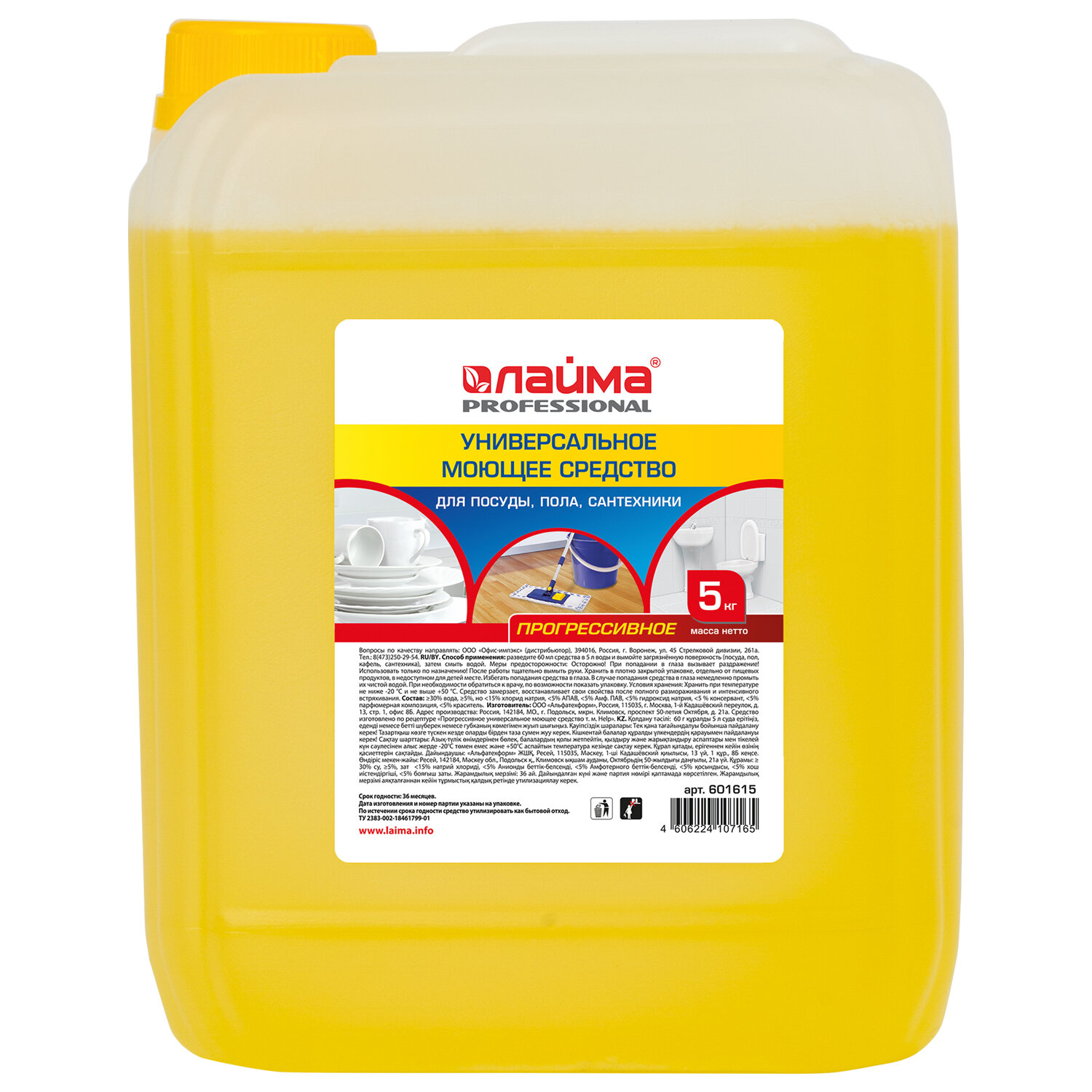 Средство моющее универсальное 5 кг, ЛАЙМА PROFESSIONAL (аналог ПРОГРЕСС) Код товара: 601615 458,43 ₽ Купить Производитель:LAIMA Универсальное моющее средство LAIMA PROFESSIONAL предназначено для мытья и обезжиривания различных твердых поверхностей: посуды, поверхностей бытового и производственного оборудования, стен и полов. Также возможно применение на поверхностях из линолеума, камня, металла, стекла, керамики, фаянса, ПВХ. Средство объемом 5 л разрешено для применения в быту, кафе, ресторанах, комбинатах общественного питания, лечебно-профилактических, учебных и детских учреждениях. Специальная формула позволяет эффективно растворять и эмульгировать масла и жиры растительного и животного происхождения, очищать поверхности от комбинированных застарелых загрязнений. Средство работает в воде любой жесткости и температуры. Нетоксично, полностью безопасно при использовании по назначению. Способ применения: Развести 60 мл средства (две крышки) на 5 л воды и вымыть загрязненную поверхность (посуда, пол, кафель, сантехника), затем смыть водой. Меры предосторожности: Соблюдать стандартные меры предосторожности при использовании моющих средств. Избегать попадания средства в глаза, в случае попадания промыть большим количеством воды. При чувствительной коже рук рекомендуется использовать резиновые перчатки. Состав: вода очищенная, менее 5% АПАВ, менее 5% амфотерного ПАВ, хлорид натрия, каустическая сода, парфюмерная композиция, консервант, краситель. Соответствует ТУ 2383-002-18461799-01.Производство: РоссияФорма выпуска: жидкостьСерия: ProfessionalОбъем/вес: 5000 мл/гПрофессиональное средство: даЭффект от использования: очищение поверхностиПодходит для поверхностей: акрил, дерево, кафель, линолеум, пластик, фаянс, хром, эмальОсобенности: универсальноеОтдушка: отсутствуетpH: 7Дозатор: нетУпаковка: канистраСрок годности: 36 месВес: 5,31 кгРазмер упаковки: 25 × 18.8 × 14.7 смОбъём: 0.0077 м3Промежуточная упаковка: 4 штТранспортная упаковка: 4 штШтрих-код: 4606224107165 Файлы Сертификат-1.jpg Сертификат-2.jpg Сертификат-3.jpg Сертификат-4.jpg Сертификат-5.jpg Сертификат-6.jpg Сертификат-7.jpg Сертификат-8.jpg Сертификат-9.jpg Сертификат-10.jpg Сертификат-11.jpg Сертификат-12.jpg Сертификат-13.jpg Сертификат-14.jpg Сертификат-15.jpg Сертификат-16.jpg Сертификат-17.jpg Сертификат-18.jpg Сертификат-19.jpg Сертификат-20.jpg Сертификат-21.jpg Сертификат-22.jpg Сертификат-23.jpg Сертификат-24.jpg Сертификат-25.jpg