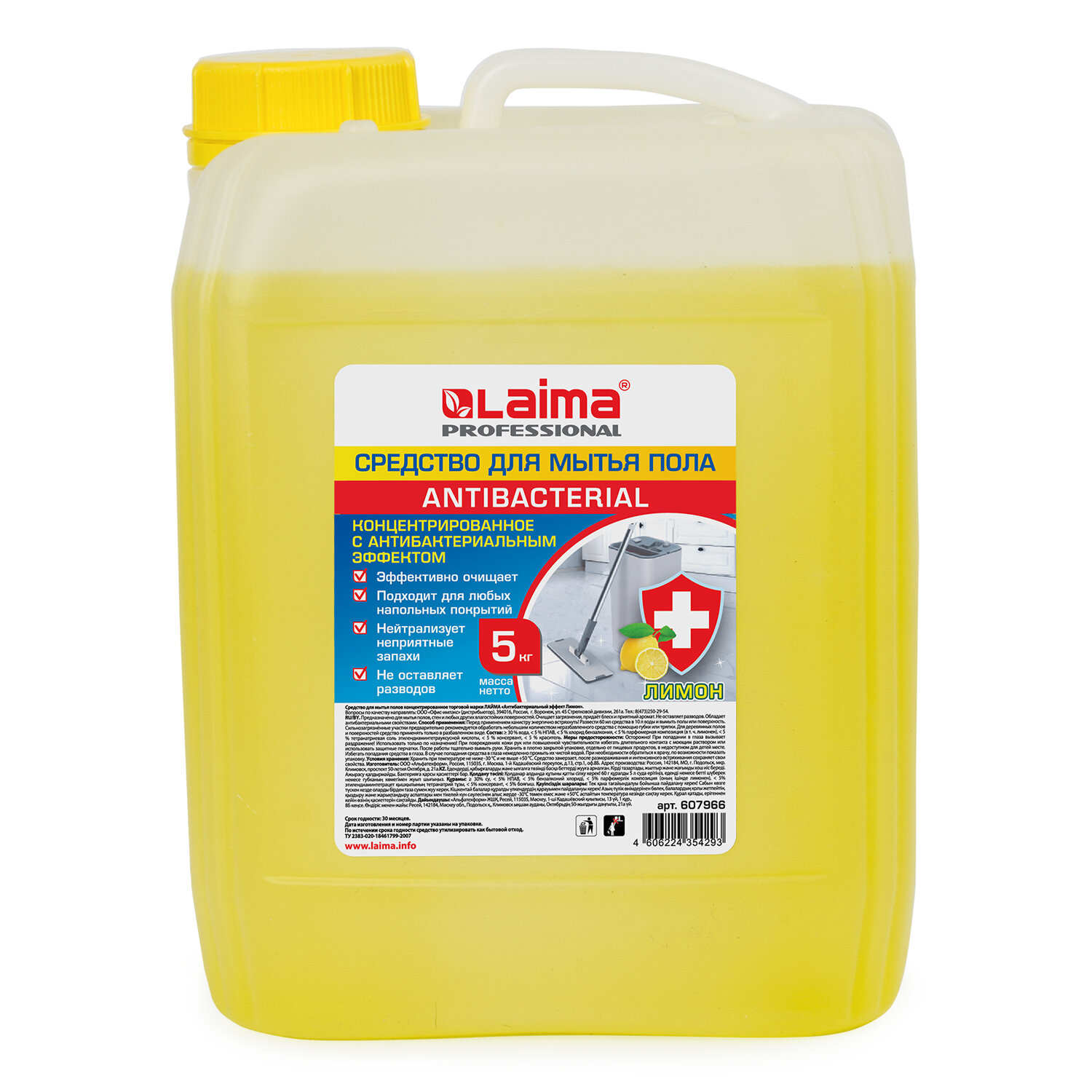 Средство для мытья пола и стен 5 кг LAIMA PROFESSIONAL концентрированное, "Антибактериальный эффект. Лимон" Код товара: 607966 595,08 ₽ Купить Производитель:LAIMA Средство для мытья пола LAIMA "PROFESSIONAL" обладает высоким уровнем чистящей и антибактериальной способности и придаёт блеск обработанным поверхностям, создавая эффект защитной плёнки. Подходит для любых поверхностей: линолеум, паркет, ламинат и т.д. Представляет собой концентрат весом 5 кг. Нейтрализует неприятные запахи, не оставляет разводов. Обладает формулой, не требующей смывания. Имеет антибактериальный эффект и нейтральный pH. Средство работает в воде любой жесткости и температуры. Нетоксично, полностью безопасно при использовании по назначению. Способ применения: перед применением энергично встряхнуть! Развести 60 мл средства (2 колпачка) в 10 л воды и вымыть полы или поверхность. Сильнозагрязнённые участки предварительно рекомендуется обработать небольшим количеством неразбавленного средства c помощью губки или тряпки. Для деревянных полов и поверхностей средство применять только в разбавленном виде. Состав: более 30% вода, менее 5% НПАВ, менее 5% хлорид бензалкония, менее 5% парфюмерная композиция (в т. ч. лимонен), менее 5% тетранатриевая соль этилендиаминтетрауксусной кислоты, менее 5% консервант, менее 5% краситель. Меры предосторожности: при попадании в глаза промыть водой. Использовать резиновые перчатки. Беречь от детей. ТУ 2383-020-18461799-2007 Условия хранения: хранить плотно закрытым. Не допускать попадания прямых солнечных лучей. Срок годности: 30 месяцев.Производство: РоссияОбъем/вес: 5000 мл/гФорма выпуска: концентратСерия: ProfessionalЭффект от использования: антимикробный эффект, нейтрализация неприятного запаха, очистка поверхностиПодходит для: полаФормула без смывания: даДезинфизирует без хлора: даОтдушка: лимонУпаковка: канистраСрок годности: 30 месВес: 5,34 кгРазмер упаковки: 24.8 × 18.8 × 14.9 смОбъём: 0.0077 м3Промежуточная упаковка: 4 штТранспортная упаковка: 4 штШтрих-код: 4606224354293 Файлы Приложение-1.pdf Сертификат-1.jpg Сертификат-2.jpg Сертификат-3.jpg Сертификат-4.jpg Сертификат-5.jpg Сертификат-6.jpg Сертификат-7.jpg Сертификат-8.jpg Сертификат-9.jpg Сертификат-10.jpg Сертификат-11.jpg Сертификат-12.jpg Сертификат-13.jpg Сертификат-14.jpg Сертификат-15.jpg Сертификат-16.jpg Сертификат-17.jpg Сертификат-18.jpg Сертификат-19.jpg Сертификат-20.jpg Сертификат-21.jpg Сертификат-22.jpg Сертификат-23.jpg Сертификат-24.jpg Сертификат-25.jpg