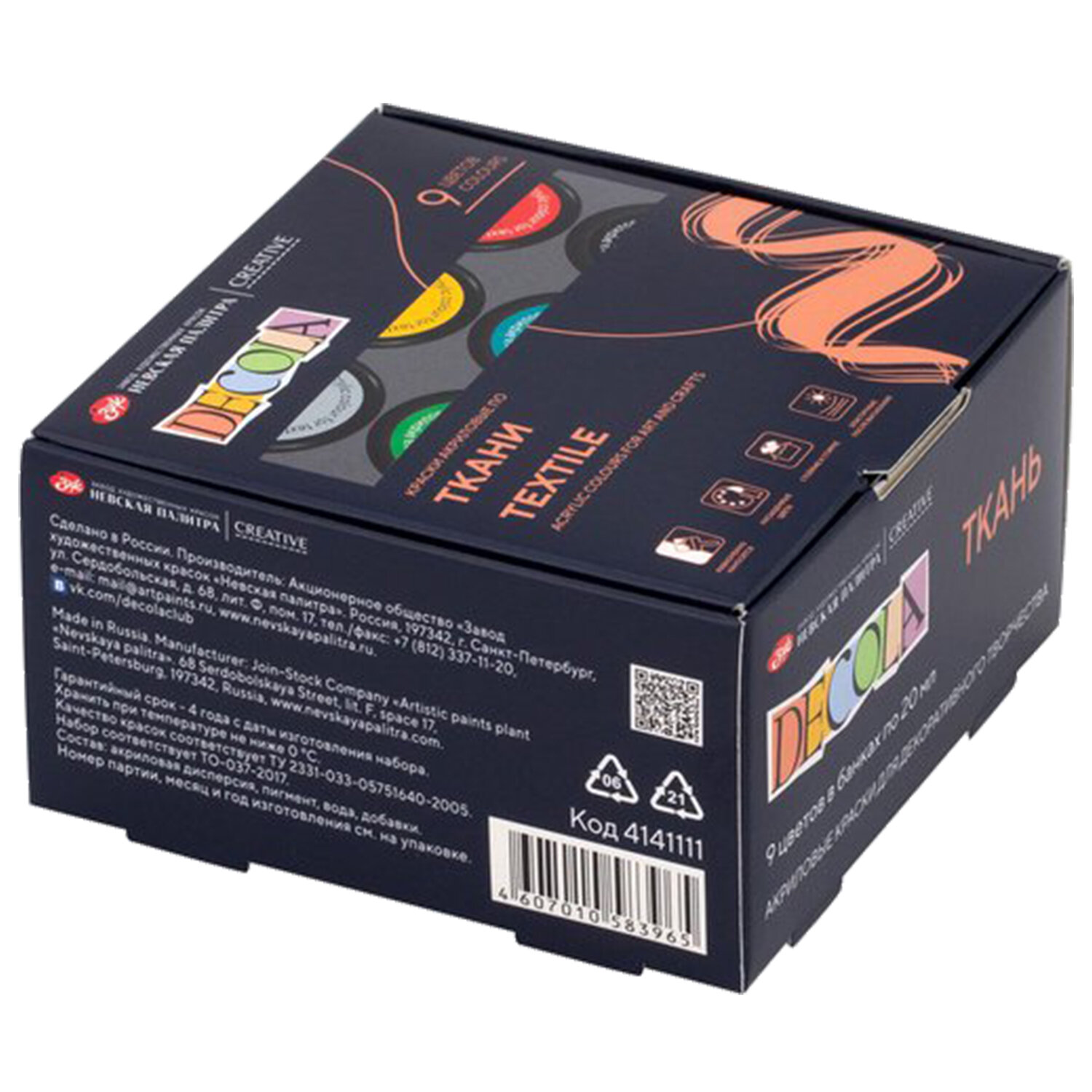 Краски по ткани акриловые "Декола", 9 цветов по 20 мл, в банках, Невская Палитра Код товара: 191045 607,23 ₽ Купить Производитель:НЕВСКАЯ ПАЛИТРА Краски высокого качества "Декола". Обладают превосходными покрывными свойствами. В наборе 9 ярких и насыщенных цветов: белый, красный, темно-синий, черный, желтый (средний), зеленый (средний), бирюзовый, серебряный, золотой. Краски обладают высокой кроющей способностью, отлично смешиваются, не тускнеют после высыхания и не выгорают при воздействии солнечных лучей.Производство: РоссияТип товара: краскиТип краски: акриловые по тканиКоличество цветов в наборе: 9 шт.Цвета: белый, бирюзовый, желтый средний, зеленый средний, золото, красный, серебро, синий темный, черныйОбъем фасовки: 20 млСпецэффект цвета: классическийФасовка: баночкаСерия: ДеколаУпаковка: картонная коробкаВес: 316 грРазмер упаковки: 5.8 × 10.4 × 10.4 смОбъём: 0.0007 м3Промежуточная упаковка: 18 штТранспортная упаковка: 18 штШтрих-код: 4607010583965 Файлы Сертификат-1.jpg Сертификат-2.jpg Сертификат-3.jpg Сертификат-4.jpg Сертификат-5.jpg Сертификат-6.jpg Сертификат-7.jpg Сертификат-8.jpg Сертификат-9.jpg Сертификат-10.jpg Сертификат-11.jpg Сертификат-12.jpg Сертификат-13.jpg Сертификат-14.jpg Сертификат-15.jpg Сертификат-16.jpg Сертификат-17.jpg Сертификат-18.jpg Сертификат-19.jpg Сертификат-20.jpg Сертификат-21.jpg Сертификат-22.jpg Сертификат-23.jpg Сертификат-24.jpg Сертификат-25.jpg Сертификат-26.jpg