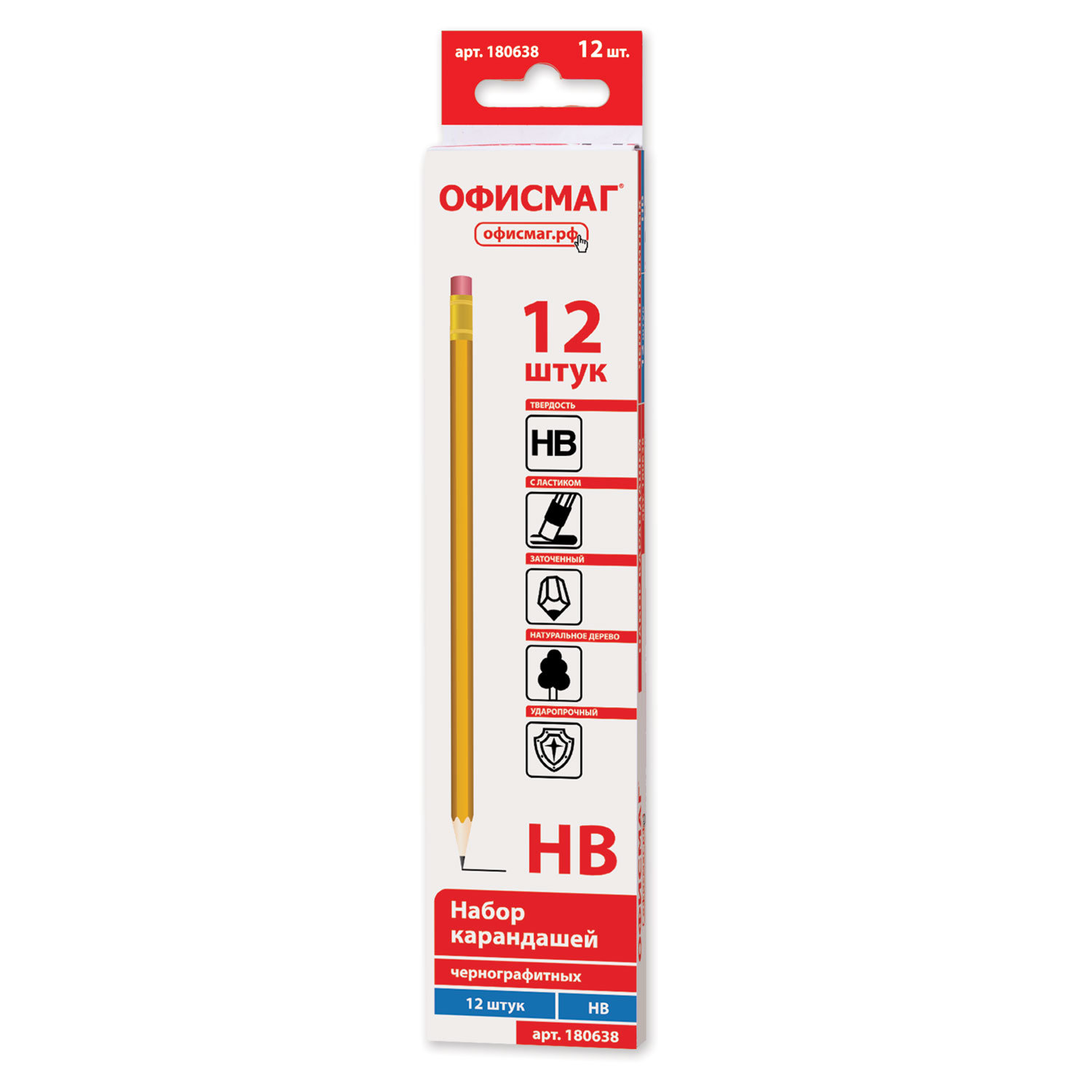 Карандаши чернографитные простые с ластиком HB, ВЫГОДНАЯ УПАКОВКА КОМПЛЕКТ 12 штук, ОФИСМАГ Код товара: 180638 126,75 ₽ Купить Производитель:ОФИСМАГ Набор чернографитных карандашей ОФИСМАГ - первый помощник для выполнения проектно-конструкторских работ, позволяет сделать легкий набросок, быстрый стремительный рисунок или нарисовать полноценную картину. Изготовлены из дерева высокого качества, оснащены ластиком. Имеют шестигранное сечение. Карандаши длиной 190 мм легко точатся и не крошатся. Обладают средней степенью твердости – HB. Диаметр грифеля - 2,05 мм. Выполнены в желтом цвете. Поставляются заточенными.Производство: КитайТвердость: HBЗаточенный: даНаличие ластика: даДиаметр грифеля: 2.05 ммКоличество карандашей в упаковке: 12 шт.Количество твердостей в наборе: 1Серия: ОФИСМАГФорма корпуса: шестиграннаяУдаропрочный грифель: даДлина карандаша: 190 ммМатериал корпуса: деревоЦвет корпуса: желтыйДизайн: без дизайнаКоличество дизайнов в упаковке: 1 шт.Упаковка: картонная коробкаВес: 84 грРазмер упаковки: 1.6 × 21.5 × 4.7 смОбъём: 0.0002 м3Промежуточная упаковка: 12 штТранспортная упаковка: 240 штШтрих-код: 4606224062259 Сертификат-1.jpg Сертификат-2.jpg Сертификат-3.jpg