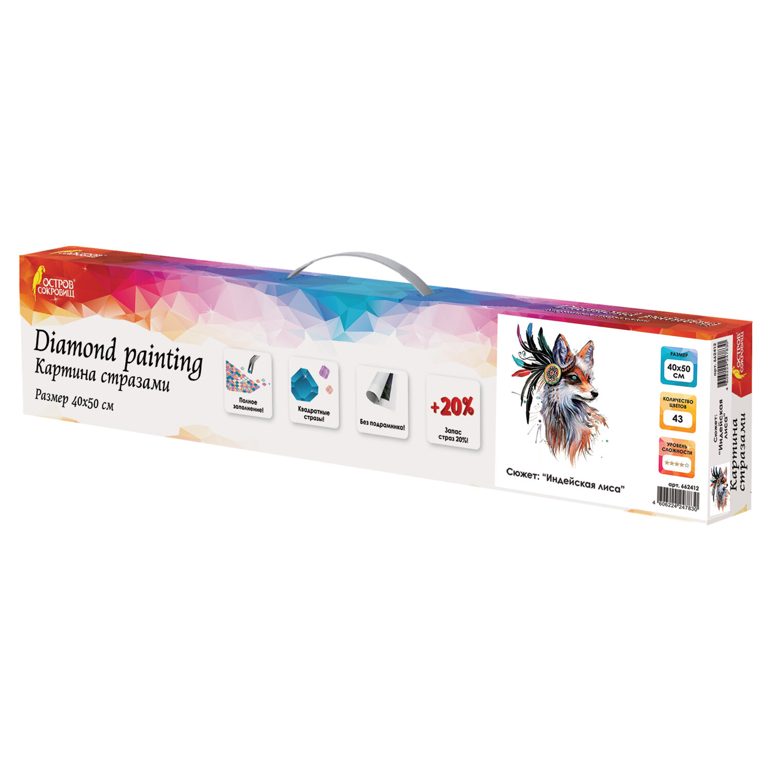 Картина стразами (алмазная мозаика) 40х50 см, ОСТРОВ СОКРОВИЩ "Индейская лиса", без подрамника Ликвидация Код товара: 662412 519,23 ₽ Купить Производитель:ОСТРОВ СОКРОВИЩ Картина стразами ОСТРОВ СОКРОВИЩ - это набор для создания картины в технике алмазной мозаики. Холст с нанесенным изображением и клеевым слоем заполняется акриловыми стразами. В наборе содержится всё необходимое для создания шедевра своими руками. Картина стразами "Индейская лиса" включает в себя: - свёрнутый холст размером 46х56 см; - набор квадратных страз разных цветов, пронумерованных в соответствии со схемой; - набор удобных закрывающихся пакетиков; - металлический пинцет; - пластиковый карандаш-стилус для захвата страз; - клеевая подушечка; - пластиковый контейнер; - схема соответствия цветов страз и символов на холсте. Размер готовой картины составляет 40х50 см. Картина полностью заполняется квадратными акриловыми стразами, благодаря чему готовая работа блистает и переливается на свету. Техника алмазной мозаики проста в исполнении и не требует владения никакими специальными навыками. Все необходимые для работы материалы и инструменты входят в набор. С подробной инструкцией можно ознакомиться на упаковке. Товар высокого качества с детально проработанной схемой и надёжным клеевым слоем, но при этом относится к среднему ценовому сегменту.Производство: КитайКоличество картин: 1 шт.Тип выкладки: полная выкладкаСюжет: Индейская лисаКоличество цветов: 43Уровень сложности: 4 из 5Комплектация: алмазная мозаикаСерия: Алмазная мозаика 40х50 смОснова картины: холст без подрамникаВозрастное ограничение от: 6 летПол: универсальныйДлина: 40 смШирина: 50 смВес: 533 грРазмер упаковки: 5.3 × 50.2 × 10 смОбъём: 0.0031 м3Промежуточная упаковка: 40 штТранспортная упаковка: 40 штШтрих-код: 4606224247830 Файлы Сертификат-1.jpg Сертификат-2.jpg Сертификат-3.jpg Сертификат-4.jpg