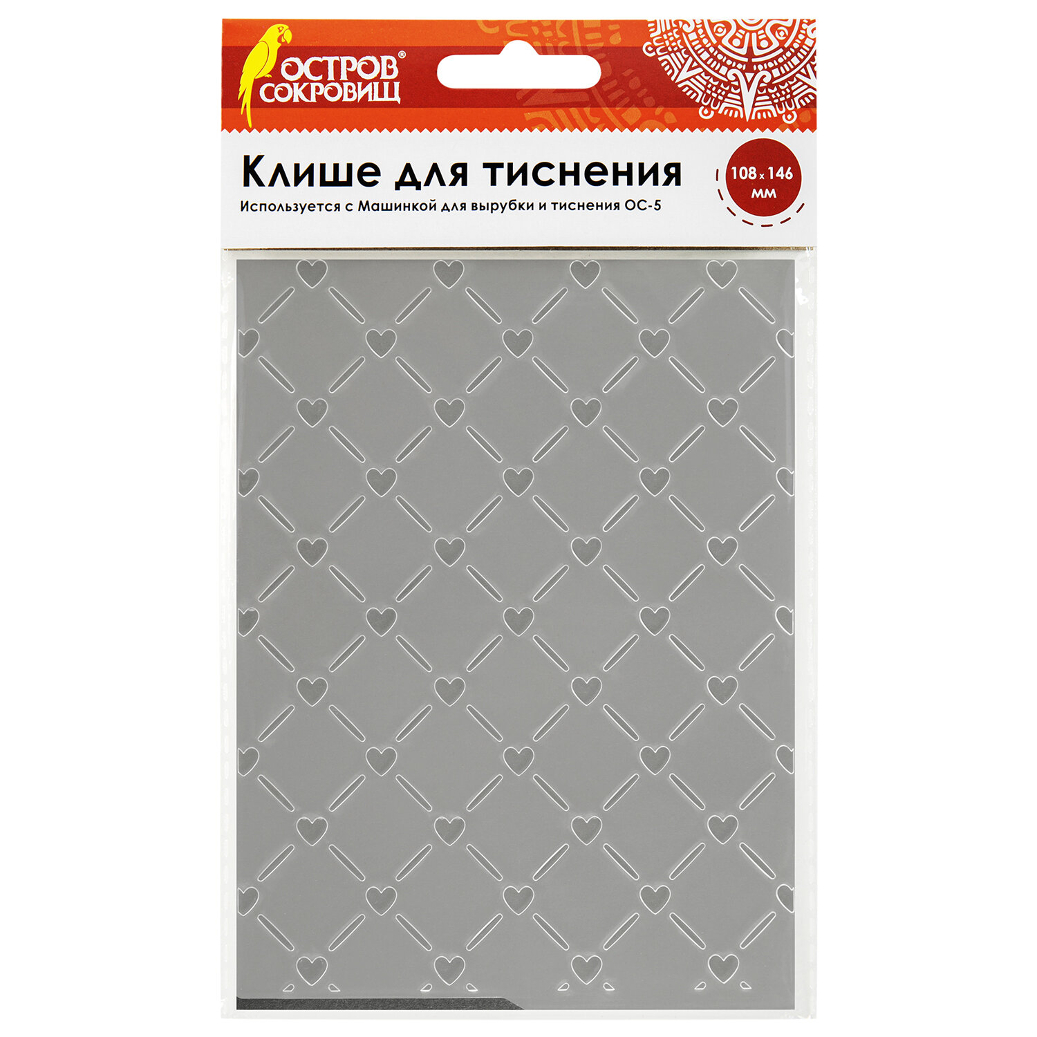 Клише для тиснения 3D "Решетка с сердцем" для Машинки ОС-5, 108х146 мм, ОСТРОВ СОКРОВИЩ, 663807 Ликвидация Код товара: 663807 97,62 ₽ Купить Производитель:ОСТРОВ СОКРОВИЩ Клише для тиснения ОСТРОВ СОКРОВИЩ - это готовые решения для эмбоссирования и создания эффекта тиснения на любых изделиях из бумаги, картона, фоамирана и других материалов. Используются в скрапбукинге и других видах творчества. Клише для тиснения представляет собой прозрачную папку, сложенную пополам, одна сторона которой имеет выпуклый фоновый рисунок - решетка с сердечками, а вторая - углубления под него. Размер клише 108х146 мм делает его удобным для оформления открыток, страничек скрап-альбомов, приглашений и других неповторимых изделий, созданных в технике скрапбукинга. Внутрь клише уже вложен лист черной бумаги для более явного отображения рисунка на клише. Клише для тиснения просты и удобны в использовании. Необходимо открыть папку, вложить в неё лист бумаги, картона или другого материала, закрыть папку и уложить в машинку для вырубки и тиснения ОС-5 в соответствии с инструкцией, входящей в набор машинки. Могут быть использованы и с другими машинками для вырубки и тиснения формата А5.Производство: КитайРазмер: 108х146 ммЦвет: прозрачныйРисунок: решетка с сердцемСерия: РельефМатериал: пластикУпаковка: пакет с европодвесомВес: 39 грРазмер упаковки: 0.3 × 14.6 × 11.6 смОбъём: 0.0001 м3Промежуточная упаковка: 48 штТранспортная упаковка: 384 штШтрих-код: 4606224305530 Сертификат-1.jpg Сертификат-2.jpg