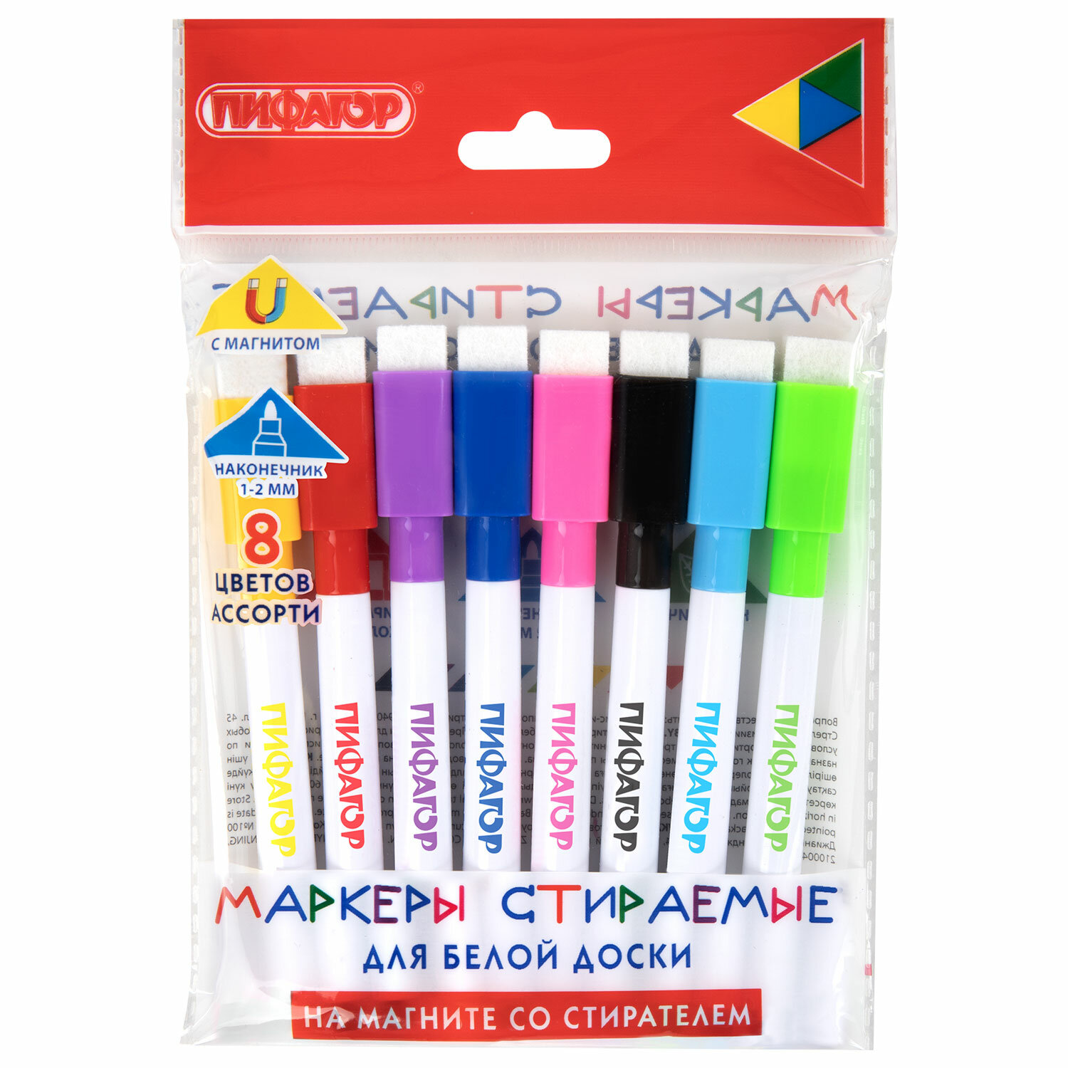 Маркеры стираемые 2 мм на магните со стирателем для белой доски и планера НАБОР 8 ЦВЕТОВ, ПИФАГОР Код товара: 152562 136,17 ₽ Купить Производитель:ПИФАГОР Набор стираемых маркеров для доски и магнитного планера ПИФАГОР предназначен для использования на изделиях с магнитно-маркерной поверхностью и стекле. Идеально подходит для рисования, игр, визуализации учебных процессов. 8 цветов в наборе: черный, розовый, синий, зеленый, голубой, фиолетовый, красный и желтый. Круглый пластиковый корпус имеет диаметр 10 мм. Пулевидный наконечник обеспечивает толщину линии письма от 1 до 2 мм, что позволяет проводить тонкие линии и использовать маркер на небольших магнитных досках и планерах. Колпачок маркера оснащен магнитом, что делает его удобным в использовании и позволяет крепить маркер прямо на доске, планере или любом другом магнитном рабочем месте. Кроме того, в колпачке имеется удобная губка-стиратель для удаления записей. Чернила на спиртовой основе быстро высыхают и легко стираются сухой губкой, не оставляя разводов. Изделие не подлежит перезаправке. Цвет колпачка соответствует цвету чернил.Производство: КитайЦвет: ассортиСерия: Маркеры стираемыеТолщина линии письма: 1, 1,5, 2Наконечник: пулевидныйКоличество в комплекте: 8 шт.Наличие магнитного держателя: даНаличие стирателя: даОснова чернил: спиртоваяЧернила стираются сухой губкой: даНе протекает при перепаде давления: даМатериал корпуса: пластикСрок годности: 60 месВес: 50 грРазмер упаковки: 1.2 × 11.7 × 11.8 смОбъём: 0.0002 м3Промежуточная упаковка: 48 штТранспортная упаковка: 384 штШтрих-код: 4606224456782 Сертификат-1.jpg Сертификат-2.jpg Сертификат-3.jpg