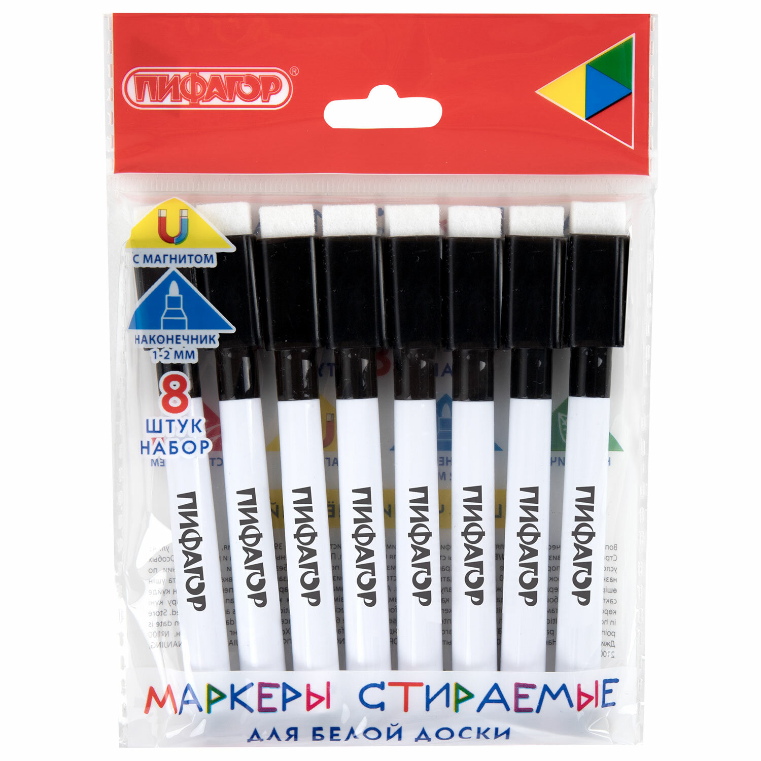 Маркеры стираемые 2 мм на магните со стирателем для белой доски и планера ЧЕРНЫЕ, НАБОР 8 ШТУК, ПИФАГОР Код товара: 152563 136,17 ₽ Купить Производитель:ПИФАГОР Набор стираемых маркеров для доски и магнитного планера ПИФАГОР предназначен для использования на изделиях с магнитно-маркерной поверхностью и стекле. Идеально подходит для рисования, игр, визуализации учебных процессов. 8 штук в наборе. Цвет чернил – черный. Круглый пластиковый корпус имеет диаметр 10 мм. Пулевидный наконечник обеспечивает толщину линии письма от 1 до 2 мм, что позволяет проводить тонкие линии и использовать маркер на небольших магнитных досках и планерах. Колпачок маркера оснащен магнитом, что делает его удобным в использовании и позволяет крепить маркер прямо на доске, планере или любом другом магнитном рабочем месте. Кроме того, в колпачке имеется удобная губка-стиратель для удаления записей. Чернила на спиртовой основе быстро высыхают и легко стираются сухой губкой, не оставляя разводов. Изделие не подлежит перезаправке. Цвет колпачка соответствует цвету чернил.Производство: КитайЦвет: черныйСерия: Маркеры стираемыеТолщина линии письма: 1, 1,5, 2Наконечник: пулевидныйКоличество в комплекте: 8 шт.Наличие магнитного держателя: даНаличие стирателя: даОснова чернил: спиртоваяЧернила стираются сухой губкой: даНе протекает при перепаде давления: даМатериал корпуса: пластикСрок годности: 60 месВес: 50 грРазмер упаковки: 1.2 × 12 × 13.1 смОбъём: 0.0002 м3Промежуточная упаковка: 48 штТранспортная упаковка: 384 штШтрих-код: 4606224456799 Сертификат-1.jpg Сертификат-2.jpg Сертификат-3.jpg