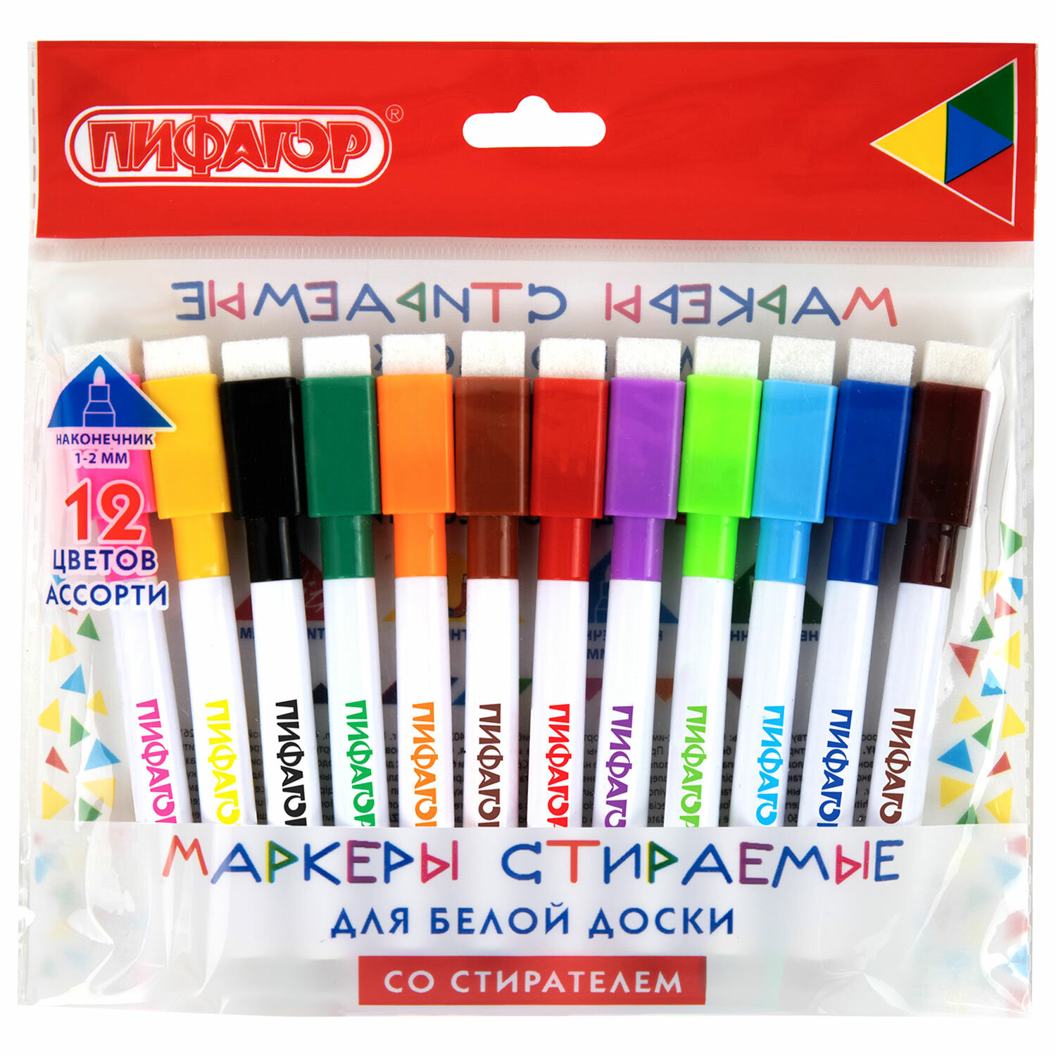 Маркеры стираемые 2 мм для белой доски и планера со стирателем НАБОР 12 ЦВЕТОВ, ПИФАГОР Код товара: 152565 179,9 ₽ Купить Производитель:ПИФАГОР Набор стираемых маркеров для доски и магнитного планера ПИФАГОР предназначен для использования на изделиях с магнитно-маркерной поверхностью и стекле. Идеально подходит для рисования, игр, визуализации учебных процессов. 12 цветов в наборе: черный, светло-коричневый, синий, светло-зеленый, голубой, фиолетовый, красный, желтый, зеленый, коричневый, оранжевый и розовый. Круглый пластиковый корпус имеет диаметр 10 мм. Пулевидный наконечник обеспечивает толщину линии письма от 1 до 2 мм, что позволяет проводить тонкие линии и использовать маркер на небольших магнитных досках и планерах. Колпачок оснащен удобной губкой-стирателем для удаления записей. Чернила на спиртовой основе быстро высыхают и легко стираются сухой губкой, не оставляя разводов. Изделие не подлежит перезаправке. Цвет колпачка соответствует цвету чернил.Производство: КитайЦвет: ассортиСерия: Маркеры стираемыеТолщина линии письма: 1, 1,5, 2Наконечник: пулевидныйКоличество в комплекте: 12 шт.Наличие стирателя: даОснова чернил: спиртоваяЧернила стираются сухой губкой: даНе протекает при перепаде давления: даМатериал корпуса: пластикСрок годности: 60 месВес: 62 грРазмер упаковки: 1.2 × 18.4 × 12.3 смОбъём: 0.0003 м3Промежуточная упаковка: 42 штТранспортная упаковка: 252 штШтрих-код: 4606224456812 Сертификат-1.jpg Сертификат-2.jpg Сертификат-3.jpg