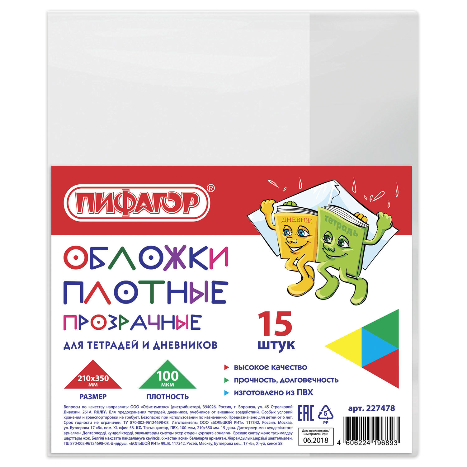 Обложки ПВХ для тетрадей и дневников, КОМПЛЕКТ 15 шт., ПЛОТНЫЕ, 100 мкм, 210х350 мм, прозрачные, ПИФАГОР Код товара: 227478 172,4 ₽ Купить Производитель:ПИФАГОР Традиционная обложка ПИФАГОР защитит тетради и дневники от механических повреждений, грязи и пыли и надолго сохранит их внешний вид! Прозрачная плотная обложка предназначена для тетрадей и дневников. Изготовлена из поливинилхлорида (ПВХ) толщиной 100 мкм. Размер: ширина - 350 мм, длина - 210 мм. Традиционная, с двумя клапанами, без возможности регулировки по ширине. В комплекте 15 штук.Производство: РоссияПредназначены для: дневников, тетрадейРазмер: 210х350 ммКоличество в комплекте: 15 шт.Материал: ПВХТолщина: 100 мкмТип обложки: глянцеваяЦвет: прозрачныйВес: 221 грРазмер упаковки: 1.4 × 22.6 × 17.4 смОбъём: 0.0003 м3Промежуточная упаковка: 60 штТранспортная упаковка: 60 штШтрих-код: 4606224196893 Сертификат-1.jpg Сертификат-2.jpg Сертификат-3.jpg