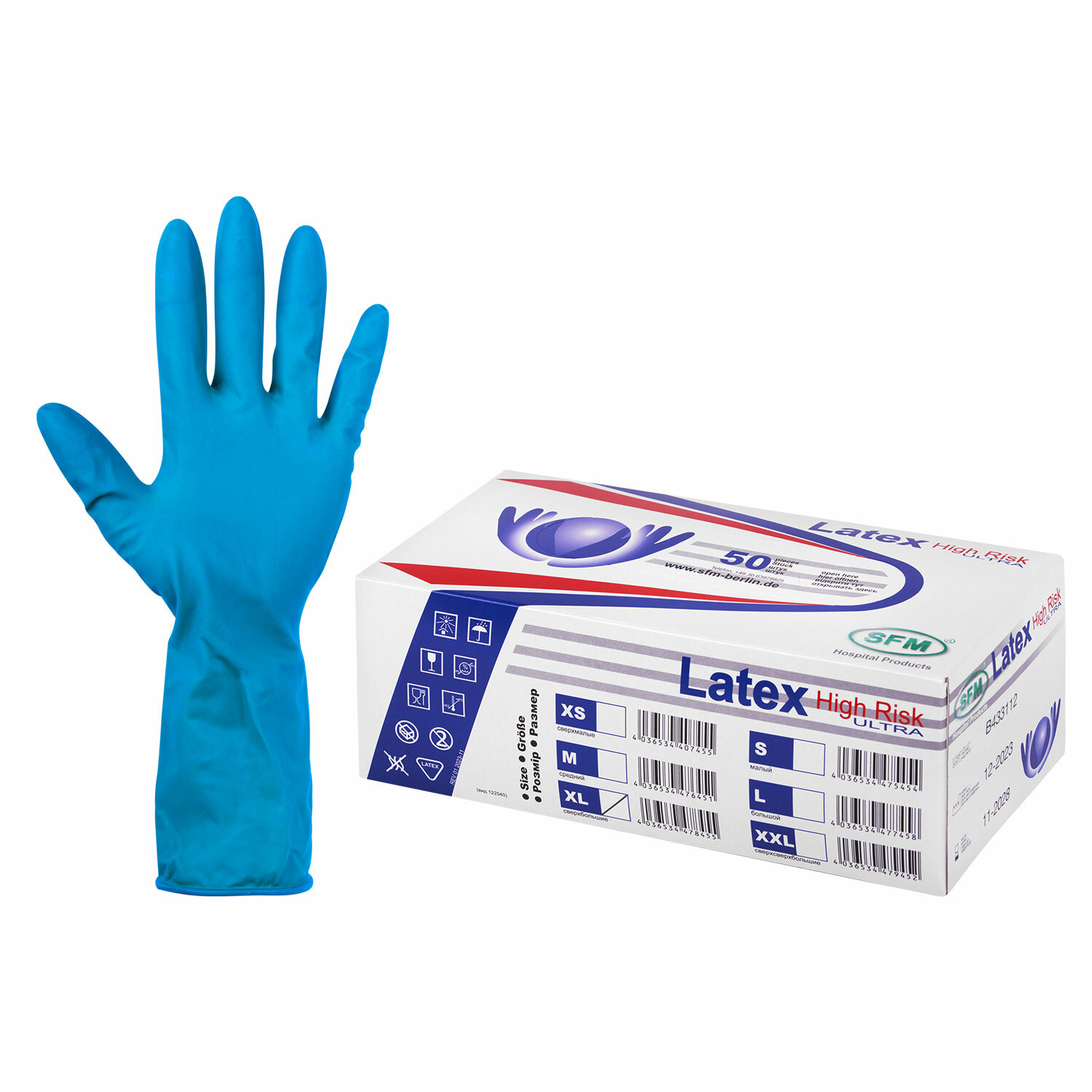 Перчатки латексные смотровые сверхпрочные SFM HIGH RISK ULTRA, Германия, 25 пар (50 штук), размер 9-10, XL (очень большой) Код товара: 631399 1 275,88 ₽ Купить Производитель:SFM Перчатки сверхпрочные SFM HIGH RISK ULTRA изготовлены из латекса, устойчивы к механическим повреждениям, обладают высоким уровнем защиты от воздействия химически агрессивных сред. Перчатки неопудренные, не разделяются на левую и правую. Отсутствие талька препятствует раздражению кожи. Имеют текстурированную и микрошероховатую поверхность, что помогает избегать скольжения. Манжета-валик на перчатках хорошо удерживается на руке и обеспечивает комфортную естественную посадку. Предназначены для одноразового использования, нестерильные. Назначение – хозяйственные службы, патологоанатомия, пищевая промышленность. Длина – 300 мм. Комплект – 25 пар (50 штук). Размер – XL (очень большой)Производство: ГерманияМатериал: латексРазмер перчаток: 9-10 (XL)Серия: SFM HIGH RISK ULTRAТип: смотровыеНеопудренные: даТип поверхности: текстурированныеПовышенная чувствительность: даХлоринация: даФорма: плоскаяОсобенности: особо прочные, удлиненная манжетаСоответствует требованиям ГОСТа: нетКоличество в комплекте: 25 парШирина ладони: 115 ммЦвет: синийВид упаковки: гофрокоробВес: 1,18 кгРазмер упаковки: 8.9 × 24.8 × 12.1 смОбъём: 0.003 м3Промежуточная упаковка: 10 штТранспортная упаковка: 10 штШтрих-код: 4036534478455 Файлы Сертификат-1.jpg Сертификат-2.jpg Сертификат-3.jpg Сертификат-4.jpg Сертификат-5.jpg Сертификат-6.jpg Сертификат-7.jpg Сертификат-8.jpg Сертификат-9.jpg Сертификат-10.jpg Сертификат-11.jpg Сертификат-12.jpg Сертификат-13.jpg Сертификат-14.jpg Сертификат-15.jpg Сертификат-16.jpg Сертификат-17.jpg Сертификат-18.jpg Сертификат-19.jpg Сертификат-20.jpg Сертификат-21.jpg Сертификат-22.jpg Сертификат-23.jpg Сертификат-24.jpg Сертификат-25.jpg Сертификат-26.jpg