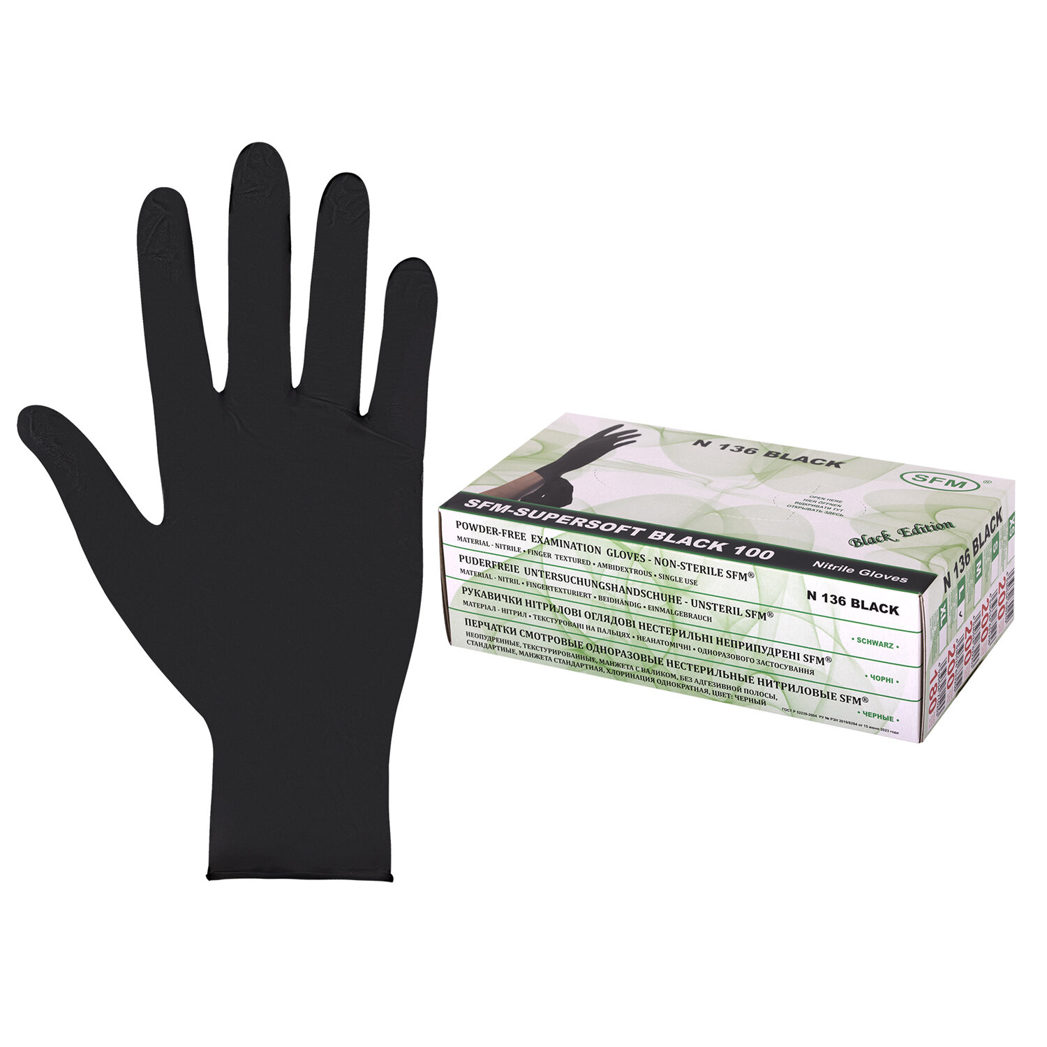 Перчатки нитриловые смотровые SFM Supersoft N136, Германия, 100 пар (200 штук), размер 8-9, L (большой), черные Код товара: 631516 1 159,1 ₽ Купить Производитель:SFM Перчатки SFM SUPERSOFT N136 BLACK нитриловые смотровые нестерильные созданы для дополнительной защиты пациентов и пользователей во время медицинского осмотра. Цвет – черный. Обработка внутренней поверхности – полимерное покрытие. Плоская форма (без разделения на правую и левую руки); текстурированные, микрошероховатая поверхность на пальцах, неопудренные. Манжета – от 240 мм; фасовка – 100 пар (200 шт.) Срок годности – 5 лет. Сферы применения: • Амбулаторный и поликлинический прием. • Стоматология. • Инфекционные больницы и отделения. • Лабораторные исследования и высокотехнологичные производства. • Промышленность (фармацевтическая, пищевая, полиграфическая, электронная, легкая). • Индустрия красоты. Производство – SFM Hospital Products GmbH, Германия.Производство: ГерманияМатериал: нитрилРазмер перчаток: 8-9 (L)Серия: SFM SUPERSOFT BLACKТип: смотровыеНеопудренные: даТип поверхности: текстурированныеХлоринация: даФорма: универсальнаяСоответствует требованиям ГОСТа: ТР ТС 019/2011Количество в комплекте: 100 парШирина ладони: 106 ммЦвет: черныйВид упаковки: картонная коробкаВес: 844 грРазмер упаковки: 7.6 × 24.7 × 12.6 смОбъём: 0.0027 м3Промежуточная упаковка: 10 штТранспортная упаковка: 10 штШтрих-код: 4036534633250 Сертификат-1.jpg Сертификат-2.jpg Сертификат-3.jpg