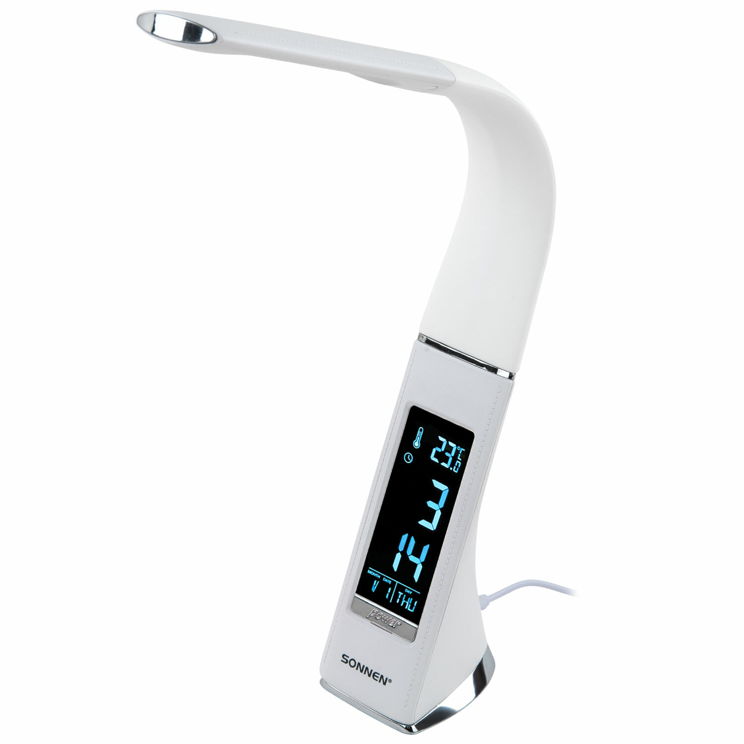 Настольная лампа / светильник SONNEN SM-01W на подставке, LCD-экран, СВЕТОДИОДНАЯ, 5 Вт, белый Код товара: 238233 2 149,93 ₽ Купить Производитель:SONNEN Настольная лампа-светильник является незаменимым атрибутом рабочего места. Модель SONNEN SM-01W прекрасно подойдет для школьника, студента и офисного сотрудника. Светильник оборудован дополнительными функциями: календарь, часы, термометр, будильник. Лампа высотой 41 см представлена в классическом белом дизайне, благодаря которому гармонично впишется в офисный или домашний интерьер. Устройство оснащено легким пластиковым корпусом и яркой LED-матрицей на 5 Вт. Освещение с цветовой температурой 5000 K и световым потоком 250 Лм обеспечивают 25 светодиодов. У прибора есть сенсорный выключатель. Благодаря 3 режимам свечения можно самостоятельно выбрать яркость света, яркость регулируется однократным нажатием на сенсорную кнопку, расположенную на задней части светильника. Светильник оборудован жидкокристаллическим дисплеем для отображения текущего времени, месяца, числа, дня недели и температуры воздуха, а также функцией будильника. Производитель сохраняет за собой право на внесение изменений в технические характеристики, комплектацию и конструкцию данной модели для улучшения эксплуатационных свойств без предварительного уведомления.Производство: КитайТип лампы: светодиоднаяТип крепления: подставкаМощность: 5 ВтЦоколь: LEDНазначение: универсальныйСерия: SM-01Цветность света: дневной белый - 4700-6000 КСветовой поток: 250 ЛюменКол-во режимов свечения: 3Источник света: 25 LEDИсточник питания: сетьРасположение кнопки выключателя: на корпусеСенсорный выключатель: даПроизвольная регулировка направления подсветки: даОтсутствие мерцания и шумов: даВысота: 41 смДлина шнура: 1.45 мМатериал корпуса: пластикЦвет корпуса: белыйВес: 880 грРазмер упаковки: 7 × 30.8 × 19.1 смОбъём: 0.0052 м3Промежуточная упаковка: 12 штТранспортная упаковка: 12 штШтрих-код: 4606224399607 Файлы Приложение-1.pdf Сертификат-1.jpg Сертификат-2.jpg Сертификат-3.jpg