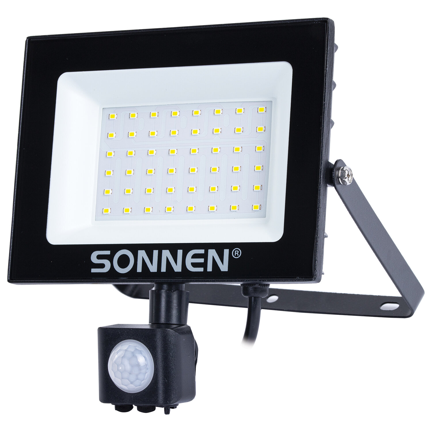 Прожектор светодиодный с датчиком движения 50 Вт, 6500 К, 4000 Лм, 50 м2, IP65, 187х176х51 мм, черный, SONNEN Код товара: 238418 801,46 ₽ Купить Производитель:SONNEN Светодиодный прожектор SONNEN – это современное решение для освещения, сочетающее эффективность, экономию энергии и длительный срок службы. Светодиодный прожектор идеально подходит для ландшафтного освещения, архитектурной подсветки, освещения рекламных конструкций, промышленных и складских помещений. Его мощность составляет 50 Вт, световой поток – 4000 лм, цветовая температура – 6500 К (холодный белый свет). Имеет высокую степень пылевлагозащиты IP65, которая позволяет использовать прожектор на улице и в помещениях с повышенной влажностью. Светодиодный прожектор оснащён поворотным регулируемым инфракрасным датчиком движения. Регулятор TIME позволяет настроить время работы прожектора после включения – от 10 секунд до 10 минут. Регулятор LUX установит порог срабатывания датчика в зависимости от уровня освещённости окружающей среды – от 10 люкс (ночное время) до 2000 люкс (дневное освещение). Регулятор SENS поможет установить чувствительность датчика в зависимости от дальности обнаружения объекта – от 4 до 10 м. Прожектор устойчив к перепадам температур и работает в диапазоне от -40 до +50 °C. Корпус прожектора выполнен из металла с антикоррозийными свойствами и дополнен закалённым стеклом. Производитель сохраняет за собой право на внесение изменений в технические характеристики, комплектацию и конструкцию данной модели для улучшения эксплуатационных свойств без предварительного уведомления.Производство: КитайНапряжение питания: 220 ВПотребляемая мощность: 50 ВтКласс пылевлагозащиты: IP65Цветовая температура: 6500 КТип датчика движения: инфракрасныйЭквивалент галогенного прожектора: 300 ВтТемпература эксплуатации: -40 + 50 °CСветовой поток: 4000 ЛмСерия: STDВысота: 176 ммШирина: 187 ммГлубина: 51 ммМатериал: стекло, металл, пластикЦвет: черныйВес: 458 грРазмер упаковки: 5.8 × 19.4 × 18 смОбъём: 0.0023 м3Промежуточная упаковка: 30 штТранспортная упаковка: 30 штШтрих-код: 4606224444079 Файлы Сертификат-1.jpg Сертификат-2.jpg Сертификат-3.jpg Сертификат-4.jpg Сертификат-5.jpg Сертификат-6.jpg Сертификат-7.jpg