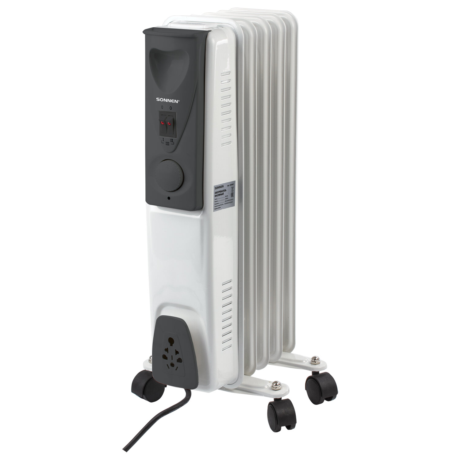 Обогреватель масляный SONNEN DFS-05, 1000 Вт, 5 секций, белый Код товара: 453497 3 059,62 ₽ Купить Производитель:SONNEN Масляный обогреватель SONNEN DFS-05 предназначен для обогрева помещений площадью до 10 м2, то есть будет незаменим на даче, в офисе и дома. Обогреватель оборудован интуитивно простым механическим управлением. Состоит из 5 секций и обладает мощностью 1000 Вт. Выключатель оснащен световым индикатором с блоком регулировки температуры. Обогреватель безопасен в эксплуатации, не сжигает кислород в помещении и обладает функцией защиты от перегрева, оборудован встроенным термостатом, имеет 3 температурных режима, а также индикатор режимов работы. Подключается к бытовой электрической сети. Обогреватель можно свободно перемещать при помощи колес и удобной ручки, предусмотрено место для хранения шнура. Может быть размещен в любом удобном месте.Производство: КитайМощность: 1000 ВтКоличество секций: 5 шт.Рекомендованная площадь обогрева: 10 м2Тип управления: механическоеТермостат (терморегулятор): даИндикация: даСерия: DFОтключение при перегреве: даНожки-колесики в комплекте: даНаличие ручки для перемещения: даМесто для хранения шнура: даДлина шнура: 1.4 мВысота товара: 545 ммШирина товара: 240 ммГлубина товара: 255 ммЦвет: белыйВес: 4.1 кгРазмер упаковки: 58.7 × 29.6 × 13.6 смОбъём: 0.0236 м3Промежуточная упаковка: 1 штТранспортная упаковка: 1 штШтрих-код: 4606224187792 Файлы Сертификат-1.jpg Сертификат-2.jpg Сертификат-3.jpg Сертификат-4.jpg Сертификат-5.jpg