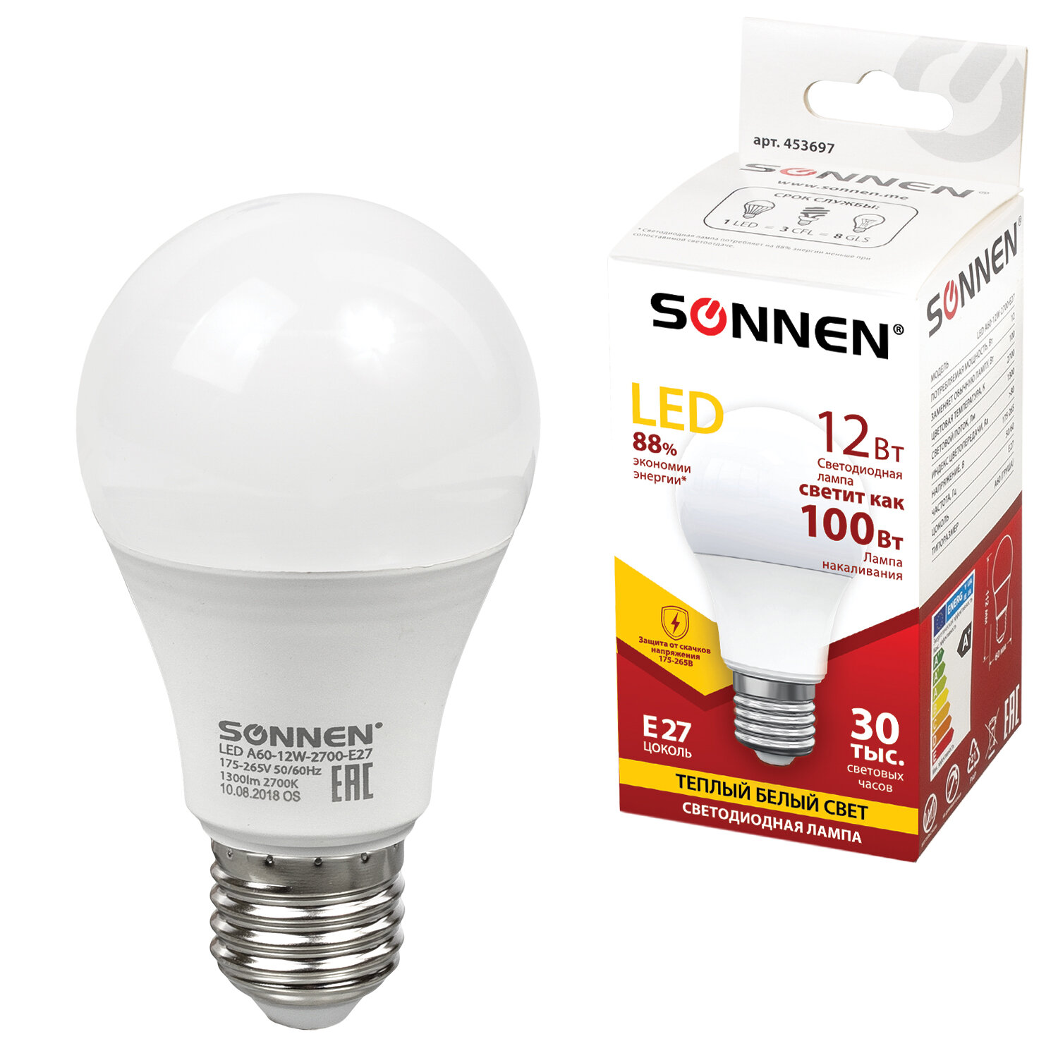 Лампа светодиодная SONNEN, 12 (100) Вт, цоколь Е27, груша, теплый белый свет, 30000 ч, LED A60-12W-2700-E27 Код товара: 453697 100,06 ₽ Купить Производитель:SONNEN Светодиодная лампа SONNEN компактного размера. Срок службы лампы составляет не менее 30000 часов, что примерно в 30 раз больше, чем у обычной лампы накаливания. Оснащена цоколем типа Е27 и излучает теплый белый cвет. Отличается длительным сроком службы. Имеет грушевидную форму колбы и сделана из белого матового пластика. Мощность лампы составляет 12 Вт. Представленная модель дает световой поток 1300 Лм нейтрального спектра, цветовая температура которого равна 2700 K. Диаметр лампы составляет 60 мм. Производитель сохраняет за собой право на внесение изменений в технические характеристики, комплектацию и конструкцию данной модели для улучшения эксплуатационных свойств без предварительного уведомления.Производство: Китай Тип цоколя : E27Оттенок света: теплый белыйМощность: 12 ВтТип лампы: светодиоднаяТип колбы: грушаВид колбы: матоваяМинимальное рабочее напряжение: 175 ВМаксимальное рабочее напряжение: 265 ВМощность эквивалентной по световому потоку лампы накаливания: 100 ВтСветовой поток: 1300 ЛмЦветовая температура: 2700 КИндекс цветопередачи: 80 %Срок службы: 30000 ч.Высота (длина) лампы: 112 ммДиаметр лампы: 60 ммВес: 39 грРазмер упаковки: 6.2 × 14.8 × 6.2 смОбъём: 0.0005 м3Промежуточная упаковка: 10 штТранспортная упаковка: 100 штШтрих-код: 4606224187877 Файлы Сертификат-1.jpg Сертификат-2.jpg Сертификат-3.jpg Сертификат-4.jpg Сертификат-5.jpg Сертификат-6.jpg