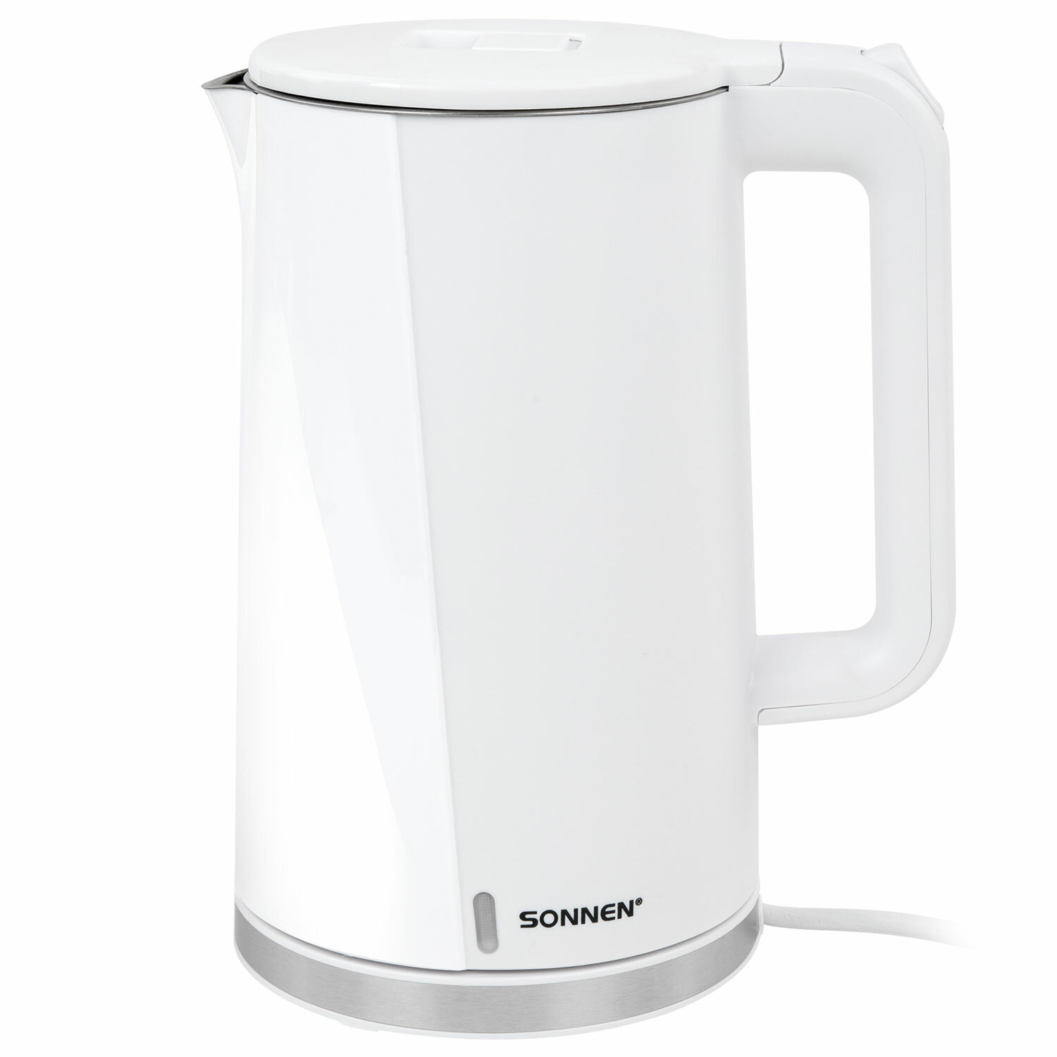 Чайник электрический с двойными стенками SONNEN KT-8718W, 1,7 л, 2200 Вт, белый Код товара: 454685 1 783,15 ₽ Купить Производитель:SONNEN Чайник SONNEN KT-8718W обладает термооболочкой, которая не дает нагреться внешнему слою корпуса – можно не бояться ожогов, когда вода в чайнике горячая. Это особенно важно, если в семье есть маленькие дети. Мощность прибора составляет 2200 Вт, что позволит воде закипеть за считанные минуты. Объема 1,7 л хватит на большую компанию или на несколько нагреваний для одного человека в течение дня. На крышке чайника находится кнопка открывания, что делает его удобным в эксплуатации. Чайник имеет адиабатный корпус: внутренняя колба сделана из нержавеющей стали, внешнее покрытие – из термостойкого пластика. Благодаря такому корпусу чайник дольше сохраняет тепло. Чайник безопасен при использовании, так как имеет автоотключение при недостаточном количестве воды и защиту от перегрева.Производство: КитайОбъем: 1.7 лМощность: 2200 ВтМатериал корпуса: нержавеющая сталь, пластикВид нагревательного элемента: закрытыйАвтоотключение при закипании: даСерия: KTОтключение при отсутствии воды: даИндикатор включения: даВращение на 360°: даДлина шнура: 0.75 мЦвет корпуса: белыйШирина: 215 ммВысота: 252 ммГлубина: 155 ммВес: 1.1 кгРазмер упаковки: 24.6 × 21.3 × 16.5 смОбъём: 0.01 м3Промежуточная упаковка: 8 штТранспортная упаковка: 8 штШтрих-код: 4606224409825 Файлы Сертификат-1.jpg Сертификат-2.jpg Сертификат-3.jpg Сертификат-4.jpg Сертификат-5.jpg