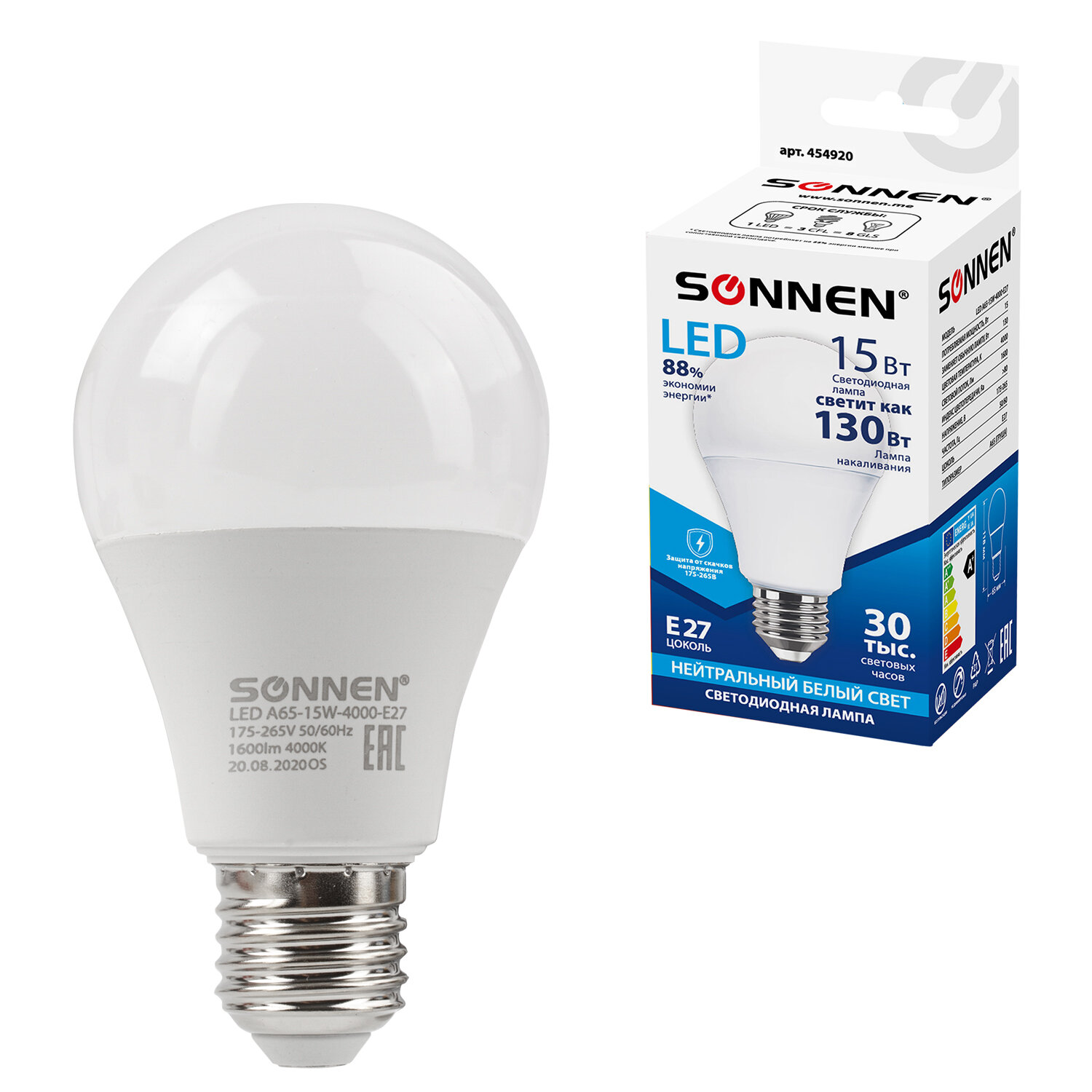 Лампа светодиодная SONNEN, 15 (130) Вт, цоколь Е27, груша, нейтральный белый, 30000 ч, LED A65-15W-4000-E27 Код товара: 454920 164 ₽ Купить Производитель:SONNEN Светодиодная лампа SONNEN компактного размера. Срок службы лампы составляет не менее 30000 часов, что примерно в 30 раз больше, чем у обычной лампы накаливания. Оснащена цоколем типа Е27 и излучает нейтральный белый cвет. Отличается длительным сроком службы. Имеет грушевидную форму колбы и сделана из белого матового пластика. Мощность лампы составляет 15 Вт. Представленная модель дает световой поток 1600 Лм, а цветовая температура равна 4000 K. Диаметр лампы составляет 65 мм. Производитель сохраняет за собой право на внесение изменений в технические характеристики, комплектацию и конструкцию данной модели для улучшения эксплуатационных свойств без предварительного уведомления.Производство: Китай Тип цоколя : E27Оттенок света: нейтральный белыйМощность: 15 ВтТип лампы: светодиоднаяТип колбы: грушаВид колбы: матоваяМинимальное рабочее напряжение: 175 ВМаксимальное рабочее напряжение: 265 ВМощность эквивалентной по световому потоку лампы накаливания: 130 ВтСветовой поток: 1600 ЛмЦветовая температура: 4000 КИндекс цветопередачи: 80 %Срок службы: 30000 ч.Высота (длина) лампы: 118 ммДиаметр лампы: 65 ммВес: 53 грРазмер упаковки: 6.4 × 15.4 × 6.3 смОбъём: 0.0006 м3Промежуточная упаковка: 100 штТранспортная упаковка: 100 штШтрих-код: 4606224264837 Файлы Сертификат-1.jpg Сертификат-2.jpg Сертификат-3.jpg Сертификат-4.jpg Сертификат-5.jpg