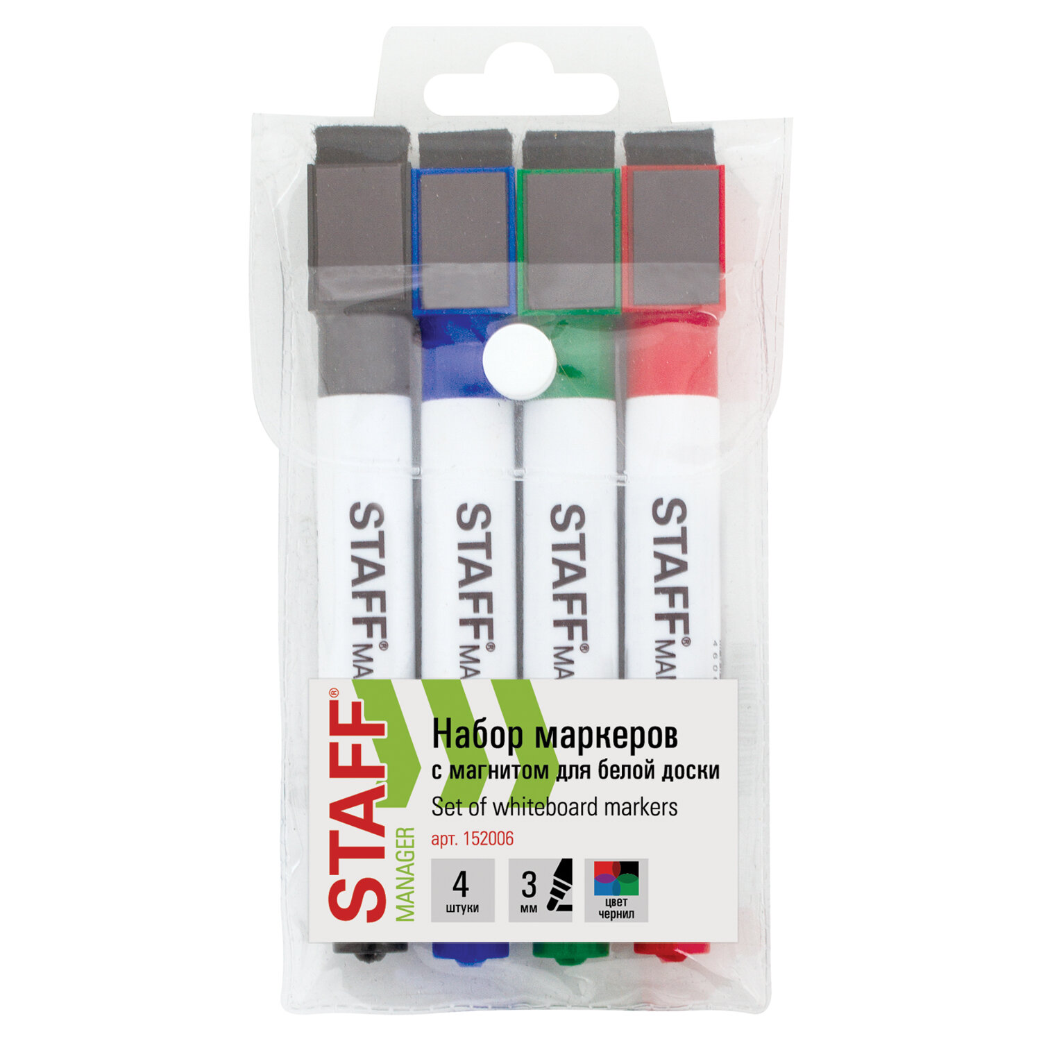 Маркеры для белой доски на магните со стирателем, НАБОР 4 цвета, STAFF "Manager" WBM-002, 3 мм Код товара: 152006 281,31 ₽ Купить Производитель:STAFF Набор маркеров на магните со стирателем STAFF "Manager" предназначен для использования на белых досках с магнитно-маркерной поверхностью. Идеально подходит для проведения презентаций, совещаний, уроков. В наборе 4 маркера для доски, заправленные чернилами черного, красного, синего и зеленого цвета. Колпачок маркера оснащен магнитом для крепления к любой металлической поверхности и губкой для быстрой корректировки текста во время написания. Наконечник круглой формы обеспечивает толщину линии письма 3 мм, что позволяет писать крупным шрифтом, который будет хорошо виден. Основа чернил - спиртовая. Чернила быстро высыхают и не оставляют разводов, легко стираются подушечкой, закрепленной на колпачке или специальным стирателем для магнитно-маркерных досок. Изделие не перезаправляется. Цвет колпачка соответствует цвету чернил.Производство: КитайЦвет: ассортиСерия: STAFF ManagerТолщина линии письма: 3Наконечник: круглыйКоличество в комплекте: 4 шт.Наличие магнитного держателя: даНаличие стирателя: даОснова чернил: спиртоваяЧернила стираются сухой губкой: даНе протекает при перепаде давления: даМатериал корпуса: пластикСрок годности: 60 месВес: 77 грРазмер упаковки: 2.5 × 14.8 × 8.3 смОбъём: 0.0004 м3Промежуточная упаковка: 48 штТранспортная упаковка: 288 штШтрих-код: 4606224293912 Сертификат-1.jpg Сертификат-2.jpg Сертификат-3.jpg