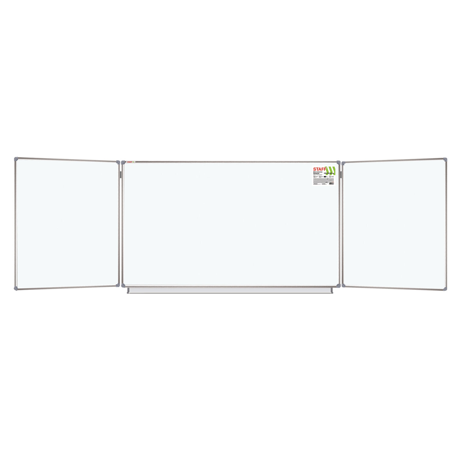 Доска магнитно-маркерная 3-х элементная 100х150/300 см, 5 рабочих поверхностей, белая, STAFF Код товара: 238010 18 199,98 ₽ Купить Производитель:STAFF Трехэлементная настенная магнитно-маркерная доска STAFF идеально подходит для использования в любых учебных учреждениях. Лаковое покрытие предназначено для письма специальными маркерами для белой доски, а металлическая поверхность позволяет размещать информацию при помощи магнитов. Состоит из 3-х элементов: центральная односторонняя секция – 100х150 см, двусторонние боковые секции – каждая по 100х75 см. Элементы крепления и полка для принадлежностей входят в комплект. Цвет: белый. Перед началом работы необходимо удалить защитную пленку с рабочей поверхности доски.Производство: КитайТип доски: трехэлементнаяРазмер доски (ВхШ): 100х150 смМаксимальная ширина доски: 300 смВысота в сборе: 100 смПокрытие рабочей поверхности: лаковоеМатериал рамы: алюминийСерия: нетУкреплённые пластиковые уголки: даРазметка: нетШирина рамки: 2.21 смТолщина рамки: 1.95 смКомплектация: полка для принадлежностей, элементы крепленияТип крепления: нетМатериал рабочей поверхности: стальВес: 13.1 кгРазмер упаковки: 105.5 × 155 × 6.2 смОбъём: 0.1014 м3Промежуточная упаковка: 1 штТранспортная упаковка: 1 штШтрих-код: 4606224360867 Файлы Сертификат-1.jpg Сертификат-2.jpg Сертификат-3.jpg Сертификат-4.jpg Сертификат-5.jpg Сертификат-6.jpg Сертификат-7.jpg Сертификат-8.jpg Сертификат-9.jpg Сертификат-10.jpg Сертификат-11.jpg Сертификат-12.jpg Сертификат-13.jpg Сертификат-14.jpg Сертификат-15.jpg Сертификат-16.jpg Сертификат-17.jpg Сертификат-18.jpg Сертификат-19.jpg Сертификат-20.jpg Сертификат-21.jpg Сертификат-22.jpg Сертификат-23.jpg Сертификат-24.jpg Сертификат-25.jpg Сертификат-26.jpg