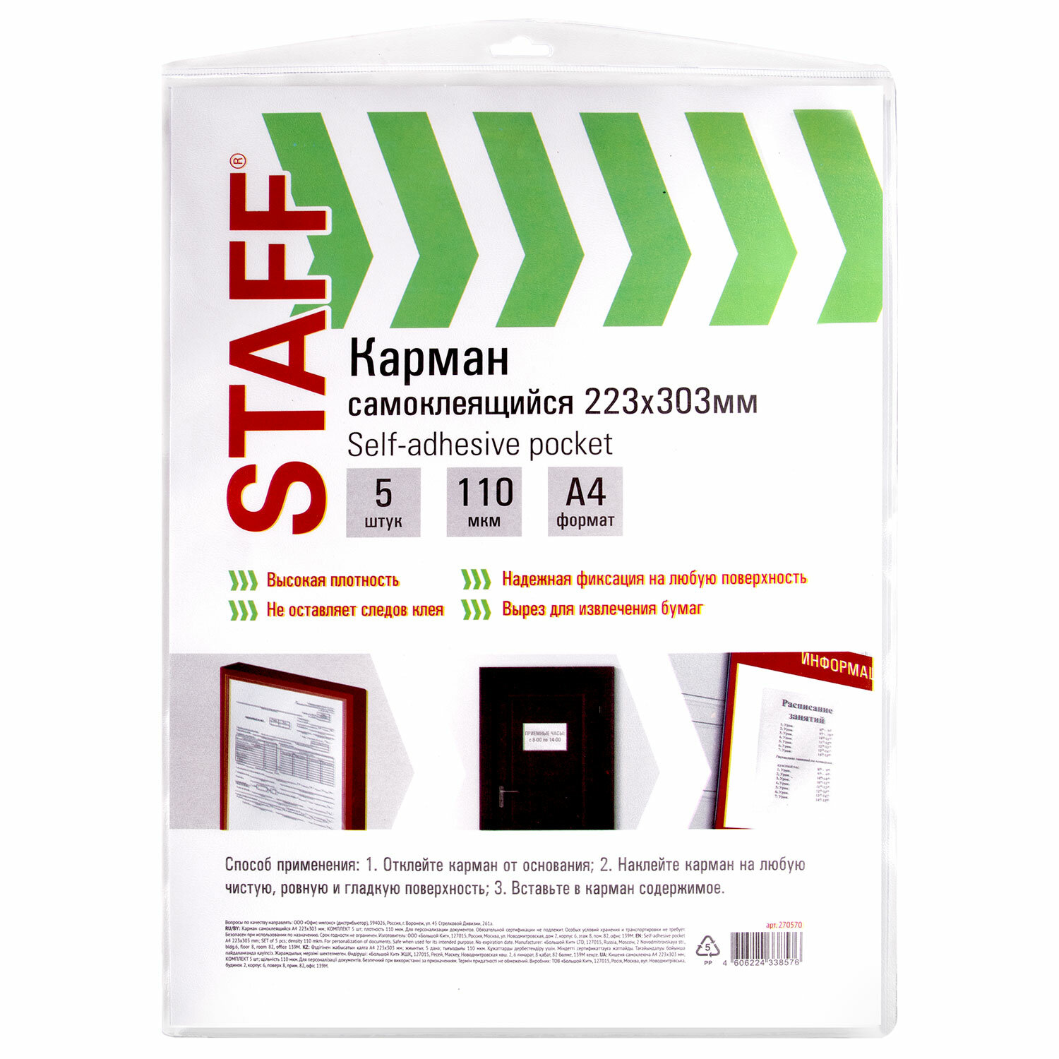 Карманы самоклеящиеся на любую поверхность ФОРМАТ А4 223х303 мм, КОМПЛЕКТ 5 шт., STAFF Код товара: 270570 323,08 ₽ Купить Производитель:STAFF Самоклеящеся карманы STAFF под листы формата А4 предназначены для размещения информации на папках, досках для объявлений и любых других ровных поверхностях. Выполнены из прочного ПВХ плотностью 110 микрон, имеют матовую фактуру и прочный шов. Клейкий прозрачный слой позволяет надежно разместить карманы на любых гладких поверхностях, а при переклеивании не оставляет следов. Для удобства извлечения бумаг на каждом кармане имеется специальный вырез. Размер карманов - 223х303 мм. В комплект входят 5 шт.Производство: РоссияНазначение: для папокФактура: матоваяКоличество в упаковке: 5 шт.Толщина: 110 мкмНе оставляют следов клея: даСерия: StandardПрозрачные: даМатериал: прочный ПВХДлина: 303 ммШирина: 223 ммТип упаковки: пакет с европодвесомВес: 167 грРазмер упаковки: 0.5 × 34.6 × 24.9 смОбъём: 0.0003 м3Промежуточная упаковка: 100 штТранспортная упаковка: 100 штШтрих-код: 4606224338576 Файлы Сертификат-1.jpg Сертификат-2.jpg Сертификат-3.jpg Сертификат-4.jpg Сертификат-5.jpg Сертификат-6.jpg Сертификат-7.jpg Сертификат-8.jpg Сертификат-9.jpg Сертификат-10.jpg Сертификат-11.jpg Сертификат-12.jpg Сертификат-13.jpg Сертификат-14.jpg Сертификат-15.jpg Сертификат-16.jpg Сертификат-17.jpg Сертификат-18.jpg Сертификат-19.jpg Сертификат-20.jpg Сертификат-21.jpg Сертификат-22.jpg Сертификат-23.jpg Сертификат-24.jpg Сертификат-25.jpg Сертификат-26.jpg