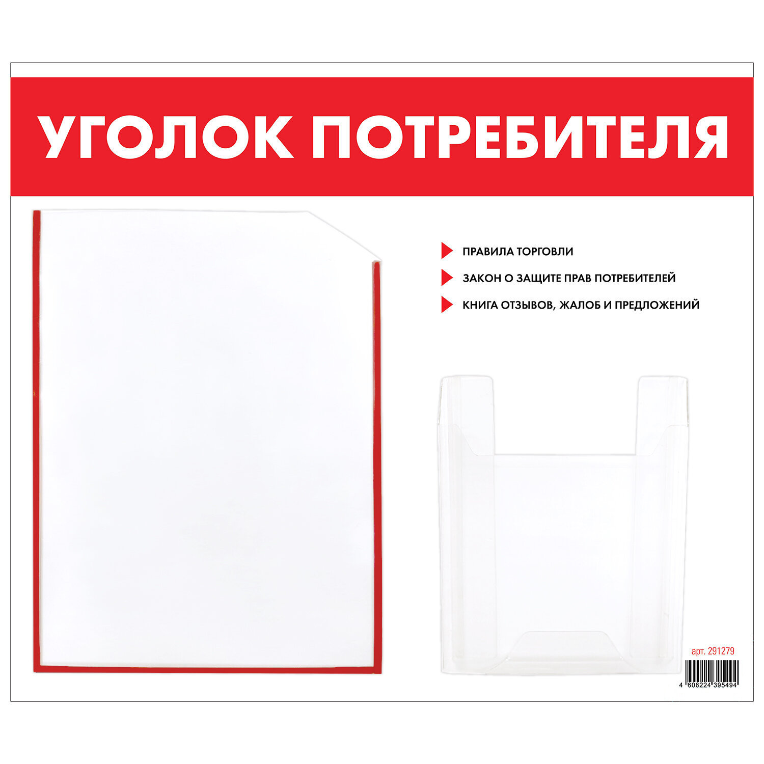 Доска-стенд "Уголок потребителя", 50х43 см, 2 кармана (плоский А4 и объемный А5), STAFF, 271279 Код товара: 291279 1 383,73 ₽ Купить Производитель:STAFF Уголок потребителя STAFF предназначен для хранения документов и размещения другой важной информации в магазине, торговом зале, ПВЗ, офисе и других помещениях. Имеет 2 кармана, изготовленных из ПЭТ: 1 плоский формата А4 и 1 объемный формата А5. Основание доски изготовлено из вспененного ПВХ белого цвета. Размер доски: 50х43 см. Элементы крепления входят в комплект. Упакован в стрейч-пленку.Производство: РоссияНазначение доски: уголок покупателяВысота доски: 43 смШирина доски: 50 смОбщее количество карманов: 2Количество плоских карманов: 1Количество объемных карманов: 1Материал основания: вспененный ПВХМатериал отделений: ПЭТОсновной цвет: белыйДополнительный цвет: красныйКомплектация: элементы крепленияВес: 0.4 кгРазмер упаковки: 4.8 × 51.8 × 45.3 смОбъём: 0.0113 м3Промежуточная упаковка: 1 штТранспортная упаковка: 1 штШтрих-код: 4606224395494 Файлы Сертификат-1.jpg Сертификат-2.jpg Сертификат-3.jpg Сертификат-4.jpg Сертификат-5.jpg Сертификат-6.jpg Сертификат-7.jpg Сертификат-8.jpg Сертификат-9.jpg Сертификат-10.jpg Сертификат-11.jpg Сертификат-12.jpg Сертификат-13.jpg Сертификат-14.jpg Сертификат-15.jpg Сертификат-16.jpg Сертификат-17.jpg Сертификат-18.jpg Сертификат-19.jpg Сертификат-20.jpg Сертификат-21.jpg Сертификат-22.jpg Сертификат-23.jpg Сертификат-24.jpg Сертификат-25.jpg Сертификат-26.jpg