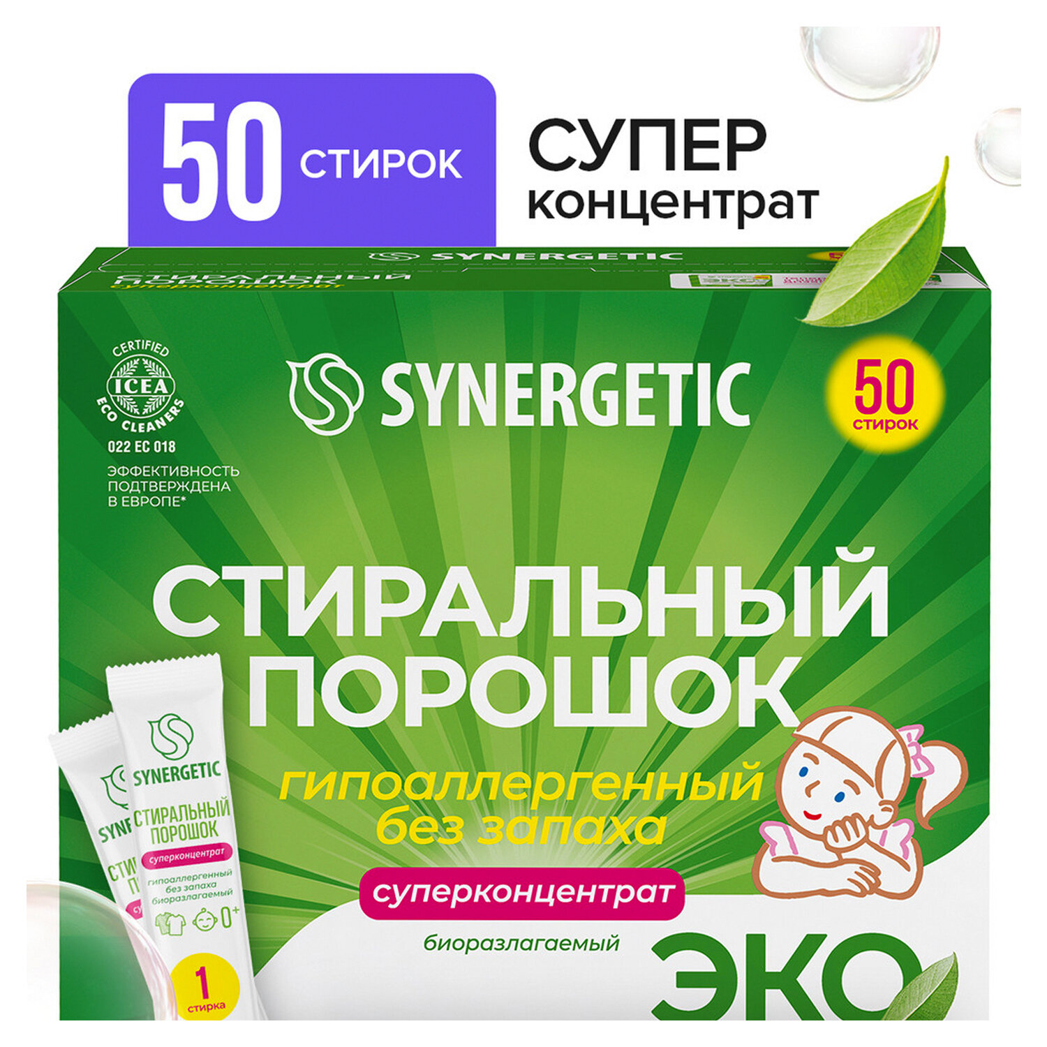 Стиральный порошок автомат 50 стиков SYNERGETIC, 50 стирок, концентрат, биоразлагаемый Код товара: 608036 1 066,82 ₽ Купить Производитель:SYNERGETIC Стиральный порошок в стиках от SYNERGETIC – это простое и удобное средство. 1 стик – обычная стирка, 2 стика – серьезные загрязнения. Стиральный порошок SYNERGETIC – экологичный, безопасный, универсальный, гипоаллергенный и эффективный суперконцентрат в стиках. Биоразлагаемый порошок создан на основе безопасных растительных компонентов, не вызывает раздражения кожи, аллергии, не оставляет запаха и подходит для стирки детского белья 0+ и одежды людей с чувствительной кожей. Подходит для белого и цветного белья из натуральных и синтетических тканей, для ручной и машинной стирки. Комбинация пяти видов энзимов, растительных ПАВ и натурального мыла эффективно удаляет загрязнения с волокон ткани даже в холодной воде и при коротких циклах стирки. Уникальный комплекс зеленых хелатов помогает устранить инкрустацию (посерение): естественный белый цвет возвращается к вещам уже после нескольких стирок. Стиральный порошок быстро растворяется в воде и не остается в одежде, полностью выполаскивается из волокон ткани. Экономичный и практичный формат стика удобен не только при использовании дома, но и для путешествий любым видом транспорта. Инструкций по применению: аккуратно оторвите край бумажного стика и засыпьте порошок в отсек стиральной машины, предназначенный для моющего средства. Закройте отсек и включите стиральную машину в соответствии с инструкцией. Используйте 1 стик порошка на 5 кг белья, для стирки сильно загрязненного белья используйте 2 стика порошка. При ручной стирке полностью растворите порошок из 1 стика в 5 литрах воды, затем положите белье в раствор и начинайте стирку. Соблюдайте режим стирки, указанный на ярлыке изделия. Не наносите порошок непосредственно на ткань во избежание изменения ее цвета. Стирайте цветные вещи при температуре не выше 40 °С. Не используйте для стирки шерсти, шелка, деликатных и мембранных тканей. Рекомендуемая температура стирки: 30-40 °С. Новые, а также белые и цветные вещи стирайте отдельно, если степень устойчивости окраски ткани неизвестна. Важно: – не наносить концентрат непосредственно на ткань; – не использовать для стирки шерсти и шелка; – стирать при 30-40 °С; – стирать новые цветные вещи отдельно; – беречь от детей; – при попадании средства в глаза промыть водой.Производство: РоссияТип: автоматВес/Объем: 1250 г/млВид средства: концентратНазначение: для всех типов бельяОтдушка: без отдушкиГипоаллергенный: даКоличество капсул/стиков: 50 шт.Серия: LAUNDRY DRYВид упаковки: картонная коробкаСрок годности: 60 месВес: 1,56 кгРазмер упаковки: 9 × 22.3 × 20.7 смОбъём: 0.005 м3Промежуточная упаковка: 4 штТранспортная упаковка: 4 штШтрих-код: 4607971450726 Сертификат-1.jpg Сертификат-2.jpg