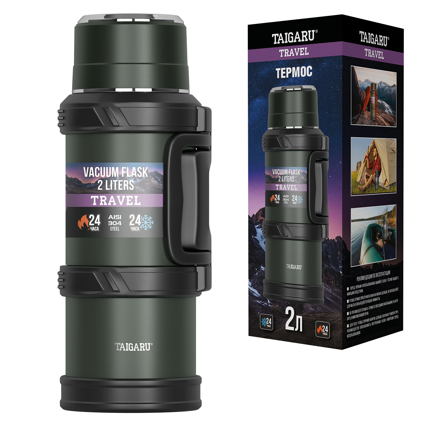 Термос 2 л TAIGARU (ТАЙГАРУ) TRAVEL, нержавеющая сталь SUS304, 2 кружки, скрытая ручка, ситечко, темно-зеленый