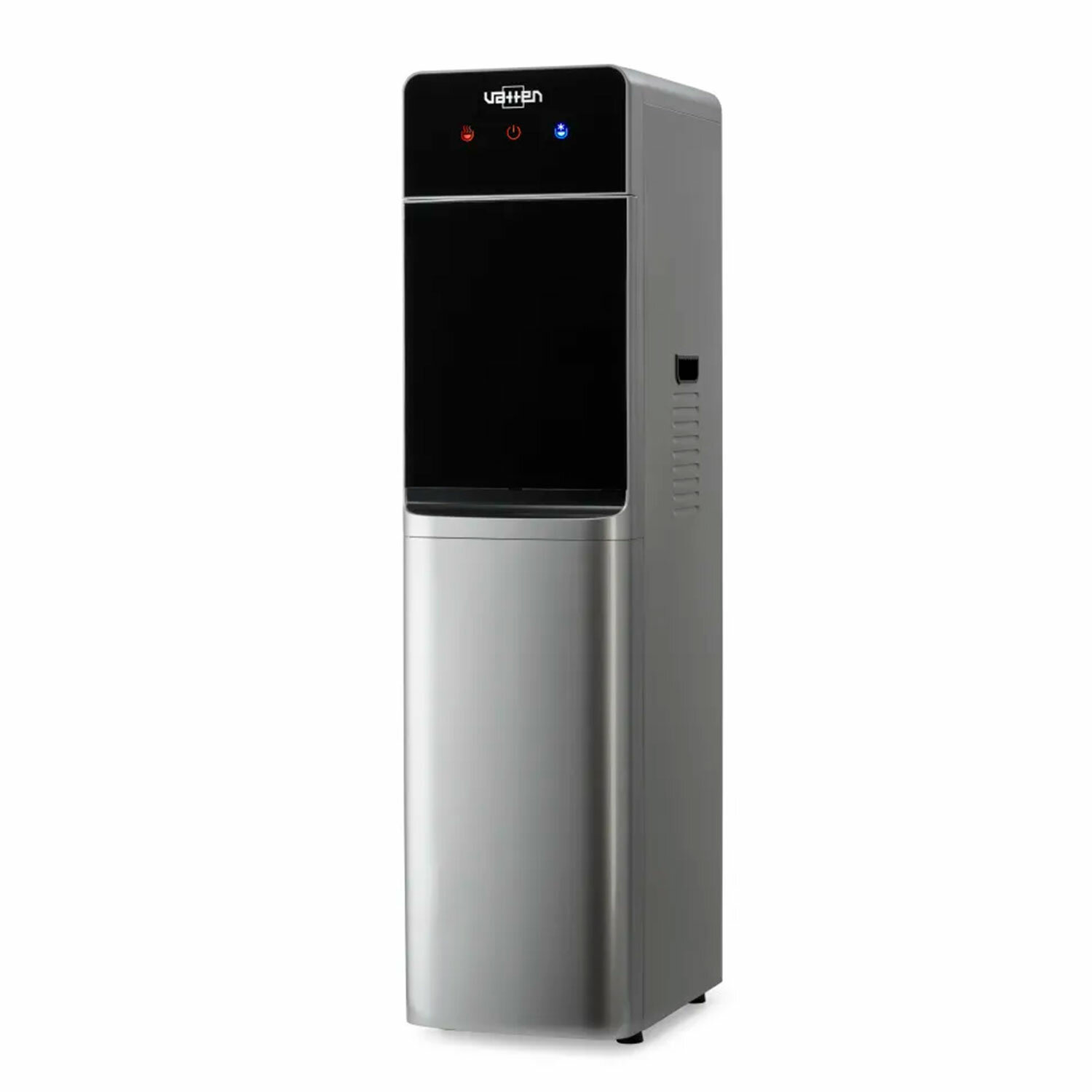 Кулер для воды VATTEN L09SE, напольный, НАГРЕВ/ОХЛАЖДЕНИЕ ЭЛЕКТРОННОЕ, бутыль снизу, 3 крана, серебристый Код товара: 458047 27 035,9 ₽ Купить Производитель:VATTEN Одна из последних моделей кулеров VATTEN L09SE с электронным охлаждением идеально подойдёт для любого места с повышенными потребностями в горячей и холодной воде: больших офисов, коттеджей, отелей, террас, бассейнов. Кулер применим даже для полупрофессионального использования, например, в столовых, коктейль-барах, барах у бассейнов, небольших пляжных барах, небольших отелях. Благодаря стильному дизайну серебристого цвета устройство идеально впишется в любой интерьер. Увеличенная мощность нагрева (800 Вт) способна обеспечить производительность горячей воды до 9 литров в час. Это позволит обеспечить кипятком для заваривания чая или кофе офис с количеством сотрудников более 20 человек. Бак горячей воды сделан из нержавеющей стали, что обеспечит отсутствие посторонних запахов и привкусов воды. Кулер исполнен по схеме с удобной нижней загрузкой бутыли. Приобретение такого кулера избавит вашу спину от напряжения при замене бутыли, поскольку нижний загрузочный отсек позволяет произвести замену, не отрывая бутыль от пола. А индикатор пустой бутыли всегда напомнит вам о необходимости замены. Если вода в бутыли закончится, то будет раздаваться предупреждающий сигнал, функции нагрева и охлаждения отключатся. В этом случае замените бутыль, закройте дверцу. Электронное тихое охлаждение стандартной производительности 0,8 литра в час с температурой холодной воды около +15 °С. В кулере предусмотрены три крана с кнопками горячей, комнатной и охлажденной воды. Всегда выключайте нагрев и охлаждение перед заменой бутыли! Подключайте аппарат к электросети только после заполнения его водой! Включение аппарата без воды может привести к его выходу из строя! Производитель оставляет за собой право без предварительного уведомления вносить изменения в технические характеристики, комплектацию и конструкцию, не ухудшающие эксплуатационные характеристики изделия.Производство: КитайТип установки: напольныйТип охлаждения: электронныйПодача воды с нагревом: даПодача воды с охлаждением: даПодача воды комнатной температуры: даКоличество кранов подачи воды: 3 шт. Серия: L09SEРекомендуемое количество пользователей: 20Крепление стаканодержателя: крепление винтами, крепление магнитомРазмещение бутыли с водой: нижнее размещениеТип крана: клавишиМощность нагрева: 800 ВтМощность охлаждения: 65 ВтПроизводительность нагрева: 9 л/часПроизводительность охлаждения: 0.8 л/часТемпература нагревания воды: 90 градусТемпература охлаждения воды: 15 градусЕмкость бака для горячей воды: 1 лЕмкость бака для холодной воды: 1 лОбъем шкафчика: 0 лНапряжение: 220 ВЦвет корпуса: серебристыйВысота: 1130 ммШирина: 280 ммГлубина: 390 ммВес: 14.52 кгРазмер упаковки: 119.2 × 44 × 33 смОбъём: 0.1731 м3Промежуточная упаковка: 1 штТранспортная упаковка: 1 штШтрих-код: 4630014934181 Файлы Приложение-1.pdf Сертификат-1.jpg Сертификат-2.jpg Сертификат-3.jpg Сертификат-4.jpg Сертификат-5.jpg Сертификат-6.jpg Сертификат-7.jpg Сертификат-8.jpg Сертификат-9.jpg