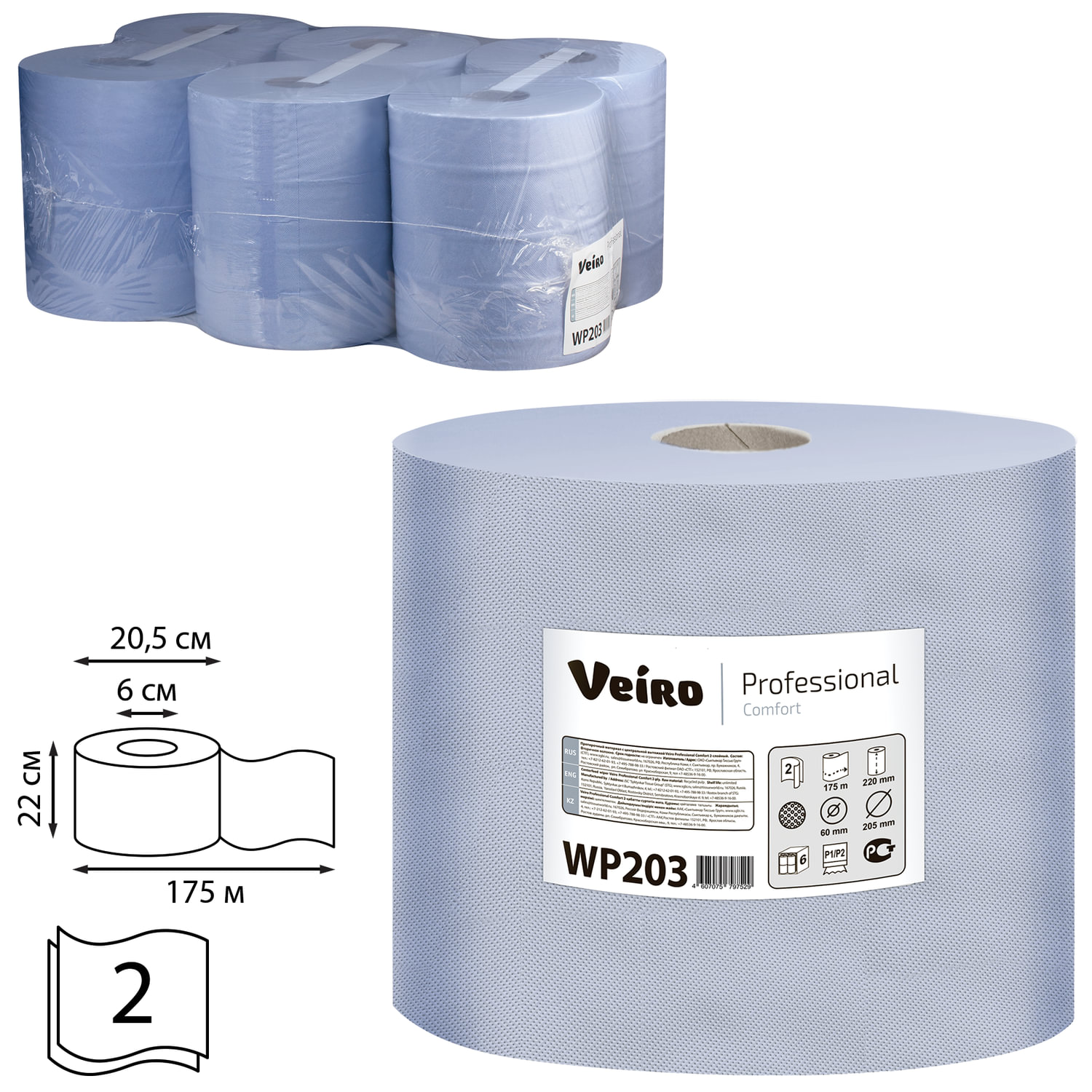 Бумага протирочная/полотенца VEIRO (W1/W2/W3), комплект 6 шт., 175 м, с центральной вытяжкой, 2-слойная, Comfort