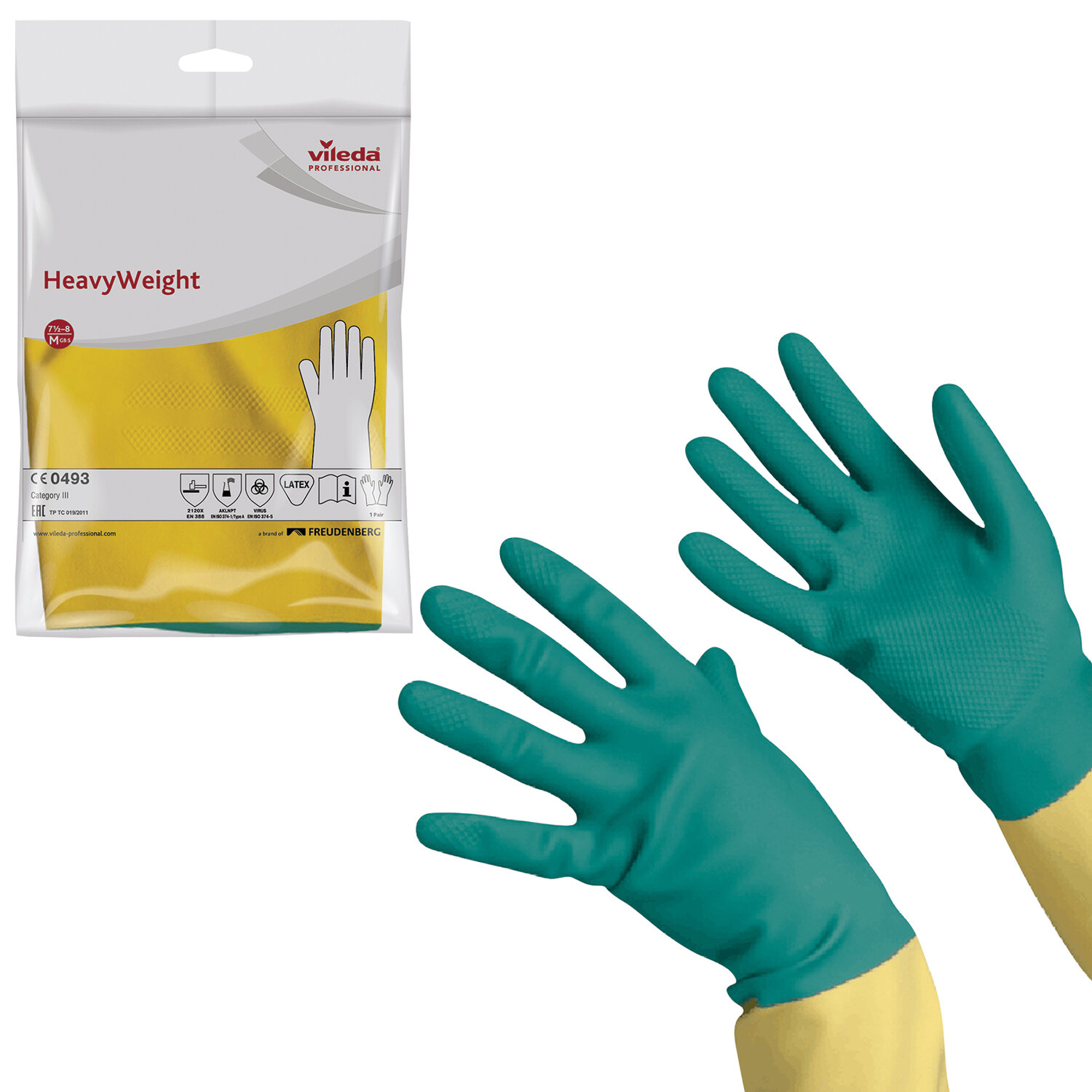 Перчатки МНОГОРАЗОВЫЕ латексные VILEDA, х/б напыление, СВЕРХПРОЧНЫЕ (неопрен), размер 7,5-8, M (средний), зелено-желтые, вес 120 г Код товара: 602154 515,57 ₽ Купить Производитель:VILEDA Усиленные перчатки для специальных работ изготовлены из натурального латекса с неопреновой обработкой, что делает их необыкновенно прочными. Защищают от агрессивной химии, очень стойкие к механическому воздействию, обеспечивают комфорт при уборке. Особенности и преимущества: - сверхпрочные трехслойные латексно-неопреновые перчатки подходят для интенсивной работы с использованием агрессивных моющих средств, - максимальная устойчивость к изнашиванию и разрывам, - хлопковая подкладка для комфортного ношения, - низкая теплопроводность – дополнительная защита рук при работе с горячей водой, - рельефная сетчатая структура на ладонях и пальцах для надежного захвата, - аккуратный волнообразный обрез манжеты, - не имеют резкого и специфичного запаха резины, - можно стирать и сушить, - высокая химическая сопротивляемость, - подходят для чистки, сельскохозяйственных работ, приготовления пищи и упаковки. Состав: латекс (натуральная резина) и неопрен, наполнитель, вулканизирующие агенты, стабилизаторы, оксид цинка, цветные пигменты, хлопковая подкладка, ZDEC (диэтилдитиокарбамат цинка). Гигиена рук очень важна для профилактики кожных заболеваний и предотвращения риска заражения. Вот почему Vileda Professional изготавливает перчатки самого высокого качества, каждая пара которых проверяется, чтобы исключить брак.Производство: Шри-ЛанкаЗащита от: химических воздействийРазмер: 7-8 (M)Размер производителя: 7,5-8 (M)Вид: хозяйственно-бытовыеМатериал основы: латекс, неопренПокрытие внешнее: нетПодкладка: хлопковое напылениеСерия: МногоразовыеСтепень защиты от кислот: неприменимоСтепень защиты от щелочей: неприменимоПоверхность области захвата: рельефная Для применения в пищевой промышленности: даКоличество в комплекте: 1 парДлина: 330 ммТолщина: 0.7 ммЦвет: зеленый/желтыйВес: 104 грРазмер упаковки: 3.2 × 19.8 × 12.6 смОбъём: 0.0004 м3Промежуточная упаковка: 50 штТранспортная упаковка: 50 штШтрих-код: 4023103244894 Сертификат-1.jpg Сертификат-2.jpg Сертификат-3.jpg