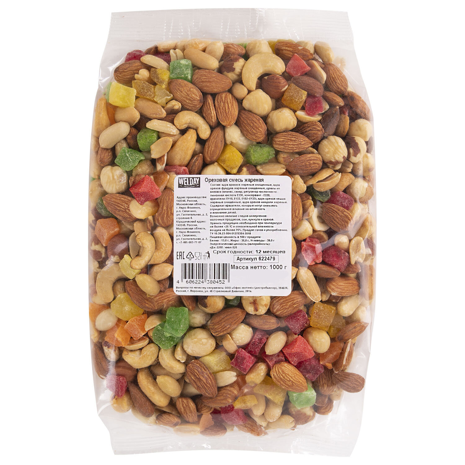 Ореховая смесь жареная WELDAY (ВЭЛДЭЙ), фундук, миндаль, арахис, кешью, ананас, 1 кг Код товара: 622479 1 020,51 ₽ Купить Производитель:WELDAY Орехи и сухофрукты являются богатым источником энергии для нашего организма, содержат много полезных питательных веществ и витаминов. Ореховую смесь WELDAY можно использовать как полезный и вкусный перекус в течение рабочего дня. Ореховая смесь жареная WELDAY. Ореховые смеси — идеальный перекус, который удобно взять с собой. Преимущество этого вида продукта заключается в том, он представляет собой комбинацию нескольких видов орехов и сладких фруктовых цукатов. Польза орехов заключается в их уникальном составе. В них содержится много натуральных масел, аминокислот и жирных кислот, которые требуются организму. Витамины и минералы также в достатке присутствуют в этом продукте. Особенно А, Е, В. Продукт готов к употреблению. Состав: ядра арахиса очищенные жареные, ядра орехов фундука жареные, цукаты из ананаса (ананас, сахар, лимонная кислота), ядра орехов кешью жареные очищенные, ядра орехов миндаля жареные. Вес – 1 кг. Упаковка: прозрачный пакет из полипропилена. Условия хранения: при температуре не более +25 °C и относительной влажности не более 75%. Срок годности – 12 месяцев.Производство: РоссияТип продукта: смесь ореховВес нетто: 1000 гОсобенности: жареныеВкус: ореховая смесьТип упаковки: пакетСрок годности: 12 мес.Фирма-производитель: НикаСрок годности: 12 месВес: 1,03 кгРазмер упаковки: 6.7 × 21 × 13.8 смОбъём: 0.0028 м3Промежуточная упаковка: 8 штТранспортная упаковка: 8 штШтрих-код: 4606224380452 Сертификат-1.jpg Сертификат-2.jpg Сертификат-3.jpg
