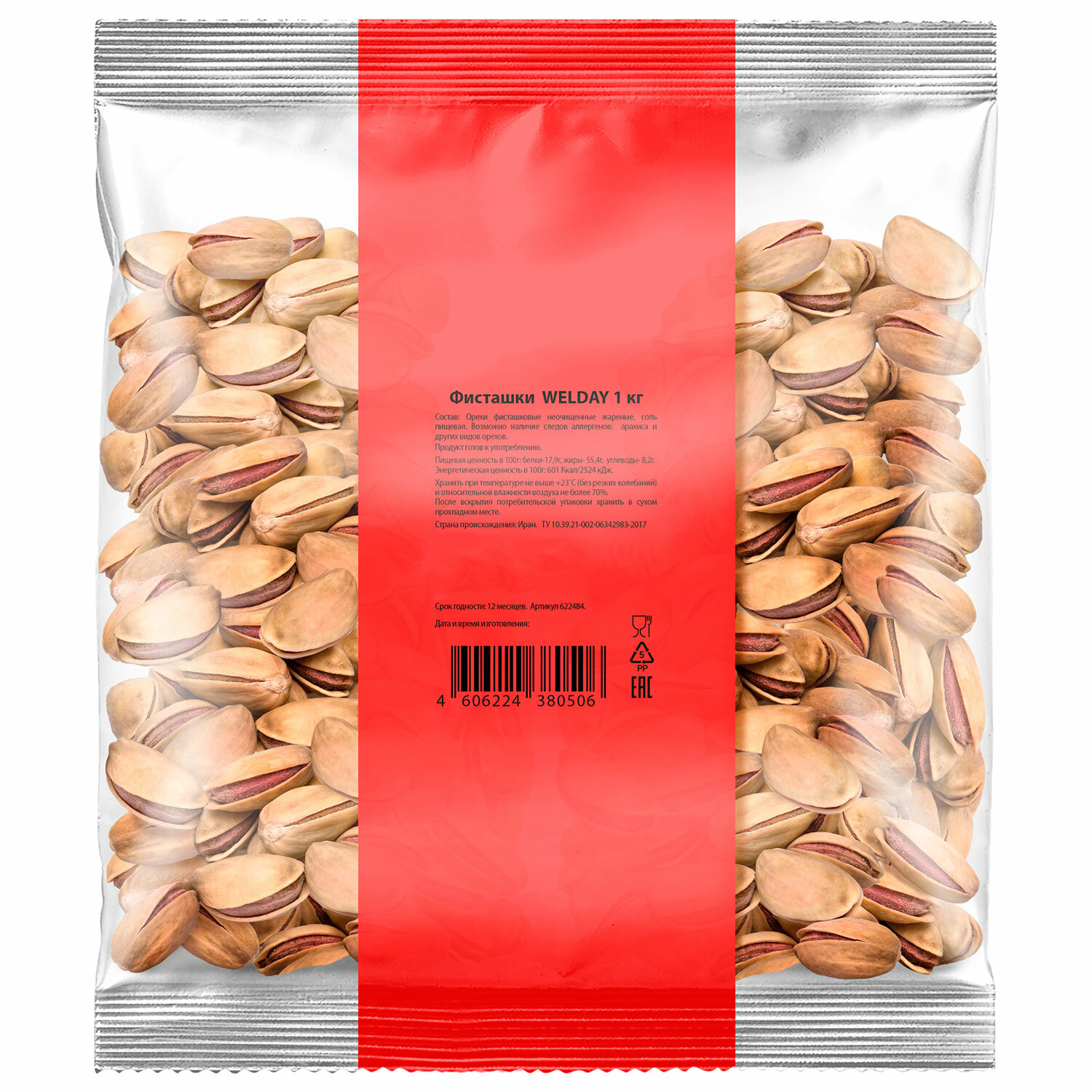 Фисташки жареные соленые Экстра WELDAY (ВЭЛДЭЙ), 1 кг Код товара: 622484 2 178,75 ₽ Купить Производитель:WELDAY Орехи и сухофрукты являются богатым источником энергии для нашего организма, содержат много полезных питательных веществ и витаминов. Жареные соленые фисташки WELDAY можно использовать как полезный и вкусный перекус в течение рабочего дня. Фисташки соленые жареные "Ахмад Агаи" – это продукт, который завоевал огромную популярность благодаря неповторимому вкусу. Как и любой другой орех, фисташки обладают множеством полезных свойств. Употребление фисташек благоприятно действует на сердечно-сосудистую систему. Фисташки знамениты тонизирующим действием на организм и антиоксидантными свойствами. Их советуют применять при истощении, физических и умственных нагрузках. Они понижают уровень холестерина, используются для профилактики атеросклероза, сердечных болезней. Эфирные масла фисташки полезны для поддержания жизненного тонуса организма. Поэтому фисташки часто именуют орехами прекрасного настроения. Продукт готов к употреблению. Состав: орехи фисташки в скорлупе жареные, соль пищевая. Вес – 1 кг. Упаковка: прозрачный пакет из полипропилена. Условия хранения: при температуре не более +25 °C и относительной влажности не более 75%. Срок годности – 12 месяцев.Производство: РоссияТип продукта: фисташкиВес нетто: 1000 гОсобенности: жареные, соленыеВкус: фисташкиТип упаковки: пакетСрок годности: 12 мес.Фирма-производитель: АЗИЯ-ФУДСрок годности: 12 месВес: 1,07 кгРазмер упаковки: 6.6 × 20 × 18 смОбъём: 0.0038 м3Промежуточная упаковка: 6 штТранспортная упаковка: 6 штШтрих-код: 4606224380506 Сертификат-1.jpg Сертификат-2.jpg Сертификат-3.jpg