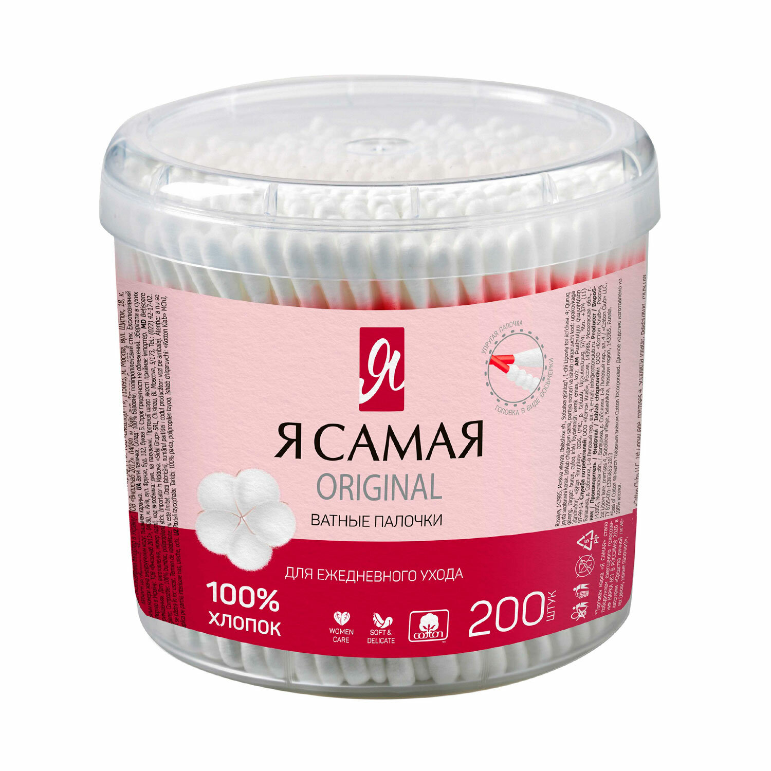 Ватные палочки КОМПЛЕКТ 200 шт., Я САМАЯ, пластиковый стакан Код товара: 117605 109,24 ₽ Купить Производитель:Я САМАЯ Ватные палочки Я САМАЯ изготовлены из 100% хлопка. Изделия применяются для косметических и гигиенических целей. Мягкие белые ватные подушечки имеют классическую форму. Отличаются плотной намоткой, что предотвращает отслаивание волокон при использовании. Двусторонние ватные палочки выполнены в белом цвете. Упругая пластиковая основа не сгибается при применении. Удобный пластиковый стакан для хранения содержит 200 штук.Производство: РоссияВид товара: ватные палочкиКоличество в комплекте: 200 шт.Двусторонние: даТип упаковки: пластиковый стаканСерия: Original CareДлина стика (палочки): 77 ммГибкий стик: даСырье: 100% хлопокЦвет: белыйВес: 69 грРазмер упаковки: 8.4 × 8.6 × 8.6 смОбъём: 0.0007 м3Промежуточная упаковка: 36 штТранспортная упаковка: 36 штШтрих-код: 4607068620032 Сертификат-1.jpg Сертификат-2.jpg