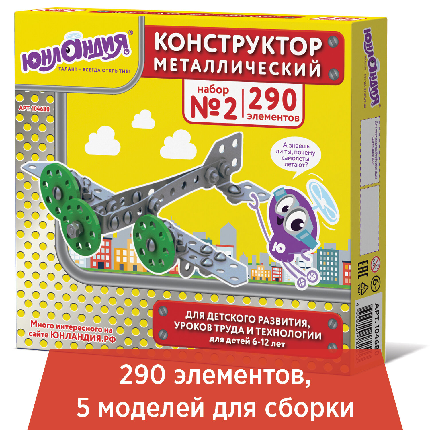 Конструктор металлический ЮНЛАНДИЯ "Для уроков труда №2", развивающий, 290 элементов Код товара: 104680 895,13 ₽ Купить Производитель:ЮНЛАНДИЯ Неистощим интерес детей к познанию мира! Конструктор металлический ЮНЛАНДИЯ "Для уроков труда №2" способствует развитию мышления, мелкой моторики, речи, фантазии младших школьников. Набор используется и на уроках труда в начальной школе. В картонной коробке упакованы металлические и пластмассовые детали, включая подвижные, крепления, ключи – всего 290 элементов, что предоставляет богатые возможности для конструирования. Комплектация: детали – 288 шт., ключ гаечный – 1 шт., отвертка – 1 шт., инструкция по сборке. Есть подробная инструкция с описанием 5 моделей. С помощью отдельных деталей ребенок сначала под руководством взрослого, а позже и самостоятельно будет создавать модели самолета, велосипеда, вертолета, машины и коляски. Набор предназначен для детей от 6 лет, уровень сложности – начальный. Цвет всех деталей – светло-серый, материал соответствует всем требованиям ГОСТа.Производство: РоссияТип товара: конструкторСерия: Для уроков трудаМатериал: металл, пластикНаличие подвижных деталей: даУровень сложности сборки: начальныйРекомендуемый возраст: от 6 летТип деталей: разные формыСюжет: транспортКоличество элементов: 290 шт.Количество моделей для сборки: 5Комплектация: инструкция по сборкеЦвет: ассортиУпаковка: картонная коробкаВес: 719 грРазмер упаковки: 3.9 × 23.3 × 20.6 смОбъём: 0.0024 м3Промежуточная упаковка: 10 штТранспортная упаковка: 10 штШтрих-код: 4606224182513 Сертификат-1.jpg Сертификат-2.jpg Сертификат-3.jpg