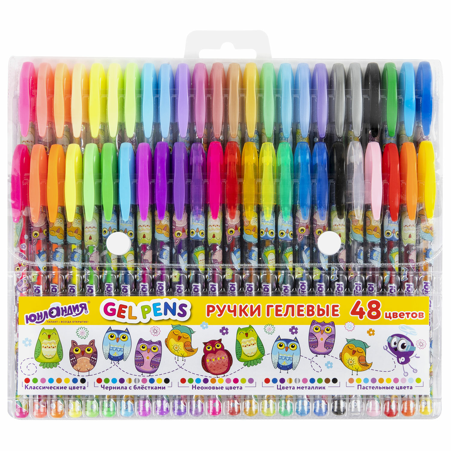 Ручка имеет круглый яркий корпус с печатью. Сменный стержень длиной 130 мм со стандартным наконечником позволит использовать ручку максимально долго. Диаметр пишущего узла, равный 1,0 мм, создает линию письма, равную 0,5 мм. Набор включает 48 гелевых ручек: 8 ручек с классическими чернилами, 10 с блестками, 10 с эффектом металлик, 10 пастельных и 10 неоновых.