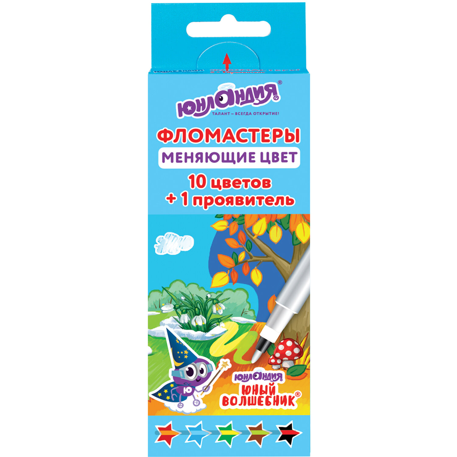 Фломастеры, меняющие цвет ЮНЛАНДИЯ 10 цветов + 1 проявитель, "ЮНЫЙ ВОЛШЕБНИК", вентилируемый колпачок Код товара: 151891 96,9 ₽ Купить Производитель:ЮНЛАНДИЯ Фломастеры, меняющие цвет ЮНЛАНДИЯ "ЮНЫЙ ВОЛШЕБНИК" - незаменимый помощник для юных художников. Яркие цвета и их преображение на бумаге порадуют как детей, так и их родителей. Фломастеры в количестве 5 штук + 1 белый фломастер-проявитель обладают яркими насыщенными цветами. Каждый фломастер имеет 2 цвета. Цвет корпуса соответствует основному цвету чернил, а цвет колпачка цвету, который проявляется после применения белого фломастера. Круглая форма корпуса, длина которого 145 мм, а диаметр 8 мм. Благодаря толщине линии письма 1 мм процесс раскрашивания становится легким. Длина письма составляет 400 м: такого расхода хватит надолго. Фломастеры изготовлены на водной основе, поэтому они безопасны и легко смываются с большинства материалов и кожи. Полипропиленовый корпус значительно продлевает срок службы фломастеров. Колпачок имеет специальные прорези для вентиляции, которые способствуют прохождению воздуха при попадании в дыхательные пути малыша. Рекомендованы для детей от 3-х лет.Производство: ИндияКоличество цветов: 10Форма корпуса: круглаяЭффект чернил: меняющие цветТип чернил: легкосмываемыеСерия: Юный волшебникШирина линии письма: 1 ммПишущий узел: 1.8 ммДлина письма: 400 мДлина корпуса: 145 ммДиаметр корпуса: 8.2 ммВентилируемый колпачок: даЗаблокированный пишущий узел: даПерекрашивающиеся: даУпаковка: картонная коробка с европодвесомВес: 50 грРазмер упаковки: 1.2 × 17.4 × 6.3 смОбъём: 0.0002 м3Промежуточная упаковка: 24 штТранспортная упаковка: 288 штШтрих-код: 4606224275925 Сертификат-1.jpg Сертификат-2.jpg Сертификат-3.jpg