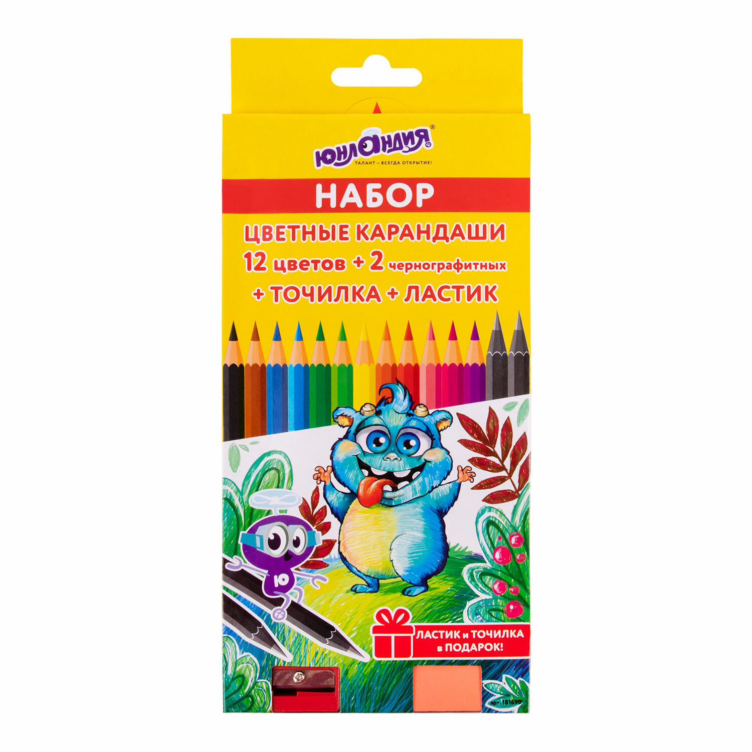 Карандаши цветные ЮНЛАНДИЯ "МОНСТРИК", 12 цветов + 2 чернографитных карандаша + ЛАСТИК + ТОЧИЛКА, шестигранные, натуральное дерево Код товара: 181690 139,92 ₽ Купить Производитель:ЮНЛАНДИЯ Карандаши цветные ЮНЛАНДИЯ "МОНСТРИК" - мягкие шестигранные карандаши, которые порадуют своей яркостью детей и их родителей. Больше не нужно искать чернографитный карандаш для эскиза, он идет в подарок в каждом наборе вместе с ластиком и точилкой! Набор состоит из 12 цветов: розовый, красный, желтый, оранжевый, салатовый, зеленый, голубой, синий, фиолетовый, коричневый, серый, черный и двух чернографитных карандашей. Ластик и точилка в комплекте. Шестигранная форма сечения корпуса позволяет карандашу не скатываться с поверхности стола во время занятий рисованием. Карандаши изготовлены из высококачественного дерева и имеют лакированный корпус. Яркий мягкий грифель диаметром 3 мм обладает повышенной прочностью и легко затачивается. Все карандаши заточены, поставляются в картонной упаковке с европодвесом.Производство: КитайКоличество цветов: 12 шт.Количество карандашей: 14 шт.Серия: МонстрикФорма сечения корпуса: шестиграннаяМатериал корпуса: деревоЛакированный корпус: даГрифель повышенной прочности: даЗаточка грифеля: даЛегко затачиваются: даДиаметр грифеля: 3 ммДлина карандаша: 176 ммТочилка в комплекте: даУпаковка: картонная коробкаВес: 108 грРазмер упаковки: 1.8 × 22.7 × 10.1 смОбъём: 0.0004 м3Промежуточная упаковка: 12 штТранспортная упаковка: 240 штШтрих-код: 4606224275956 Сертификат-1.jpg Сертификат-2.jpg Сертификат-3.jpg