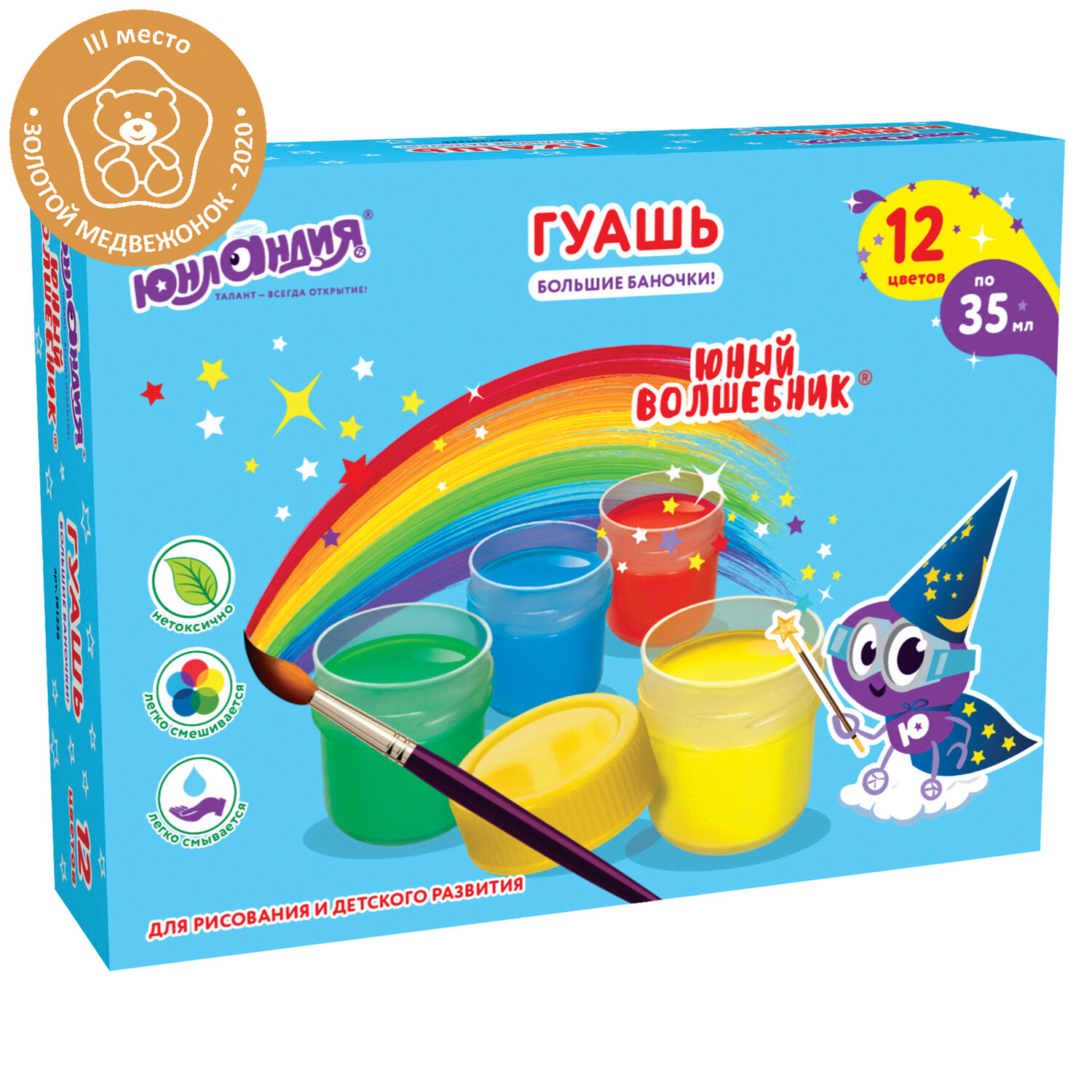 Гуашь ЮНЛАНДИЯ "ЮНЫЙ ВОЛШЕБНИК", 12 цветов по 35 мл, БОЛЬШИЕ БАНОЧКИ, высшее качество Код товара: 191336 287,52 ₽ Купить Производитель:ЮНЛАНДИЯ Гуашь высшего качества ЮНЛАНДИЯ поможет создать юным художникам первые шедевры. Идеальна для нанесения на бумагу, картон, дерево, стекло, керамику. В наборе 12 ярких сочных цветов. Краски полностью безопасны в использовании, не токсичны и не имеют резкого запаха. Гуашь имеет высокую светостойкость и укрывистость, легко размывается водой, хорошо наносится, без труда удаляется с рук и одежды. Краска упакована в пластмассовые герметичные баночки объемом 35 мл. Общий объем гуаши – 420 мл. Ребенок сможет легко открыть баночки с винтовыми крышками без помощи взрослых.Производство: РоссияКоличество цветов в наборе: 12 шт.Объем баночки: 35 млОбщий объем: 420 млТара: пластмассовая герметичная баночкаСерия: Юный волшебникУпаковка: картонная коробкаСрок годности: 36 месВес: 754 грРазмер упаковки: 4.7 × 17.5 × 13.3 смОбъём: 0.0013 м3Промежуточная упаковка: 12 штТранспортная упаковка: 12 штШтрих-код: 4606224197937 Файлы Сертификат-1.jpg Сертификат-2.jpg Сертификат-3.jpg Сертификат-4.jpg
